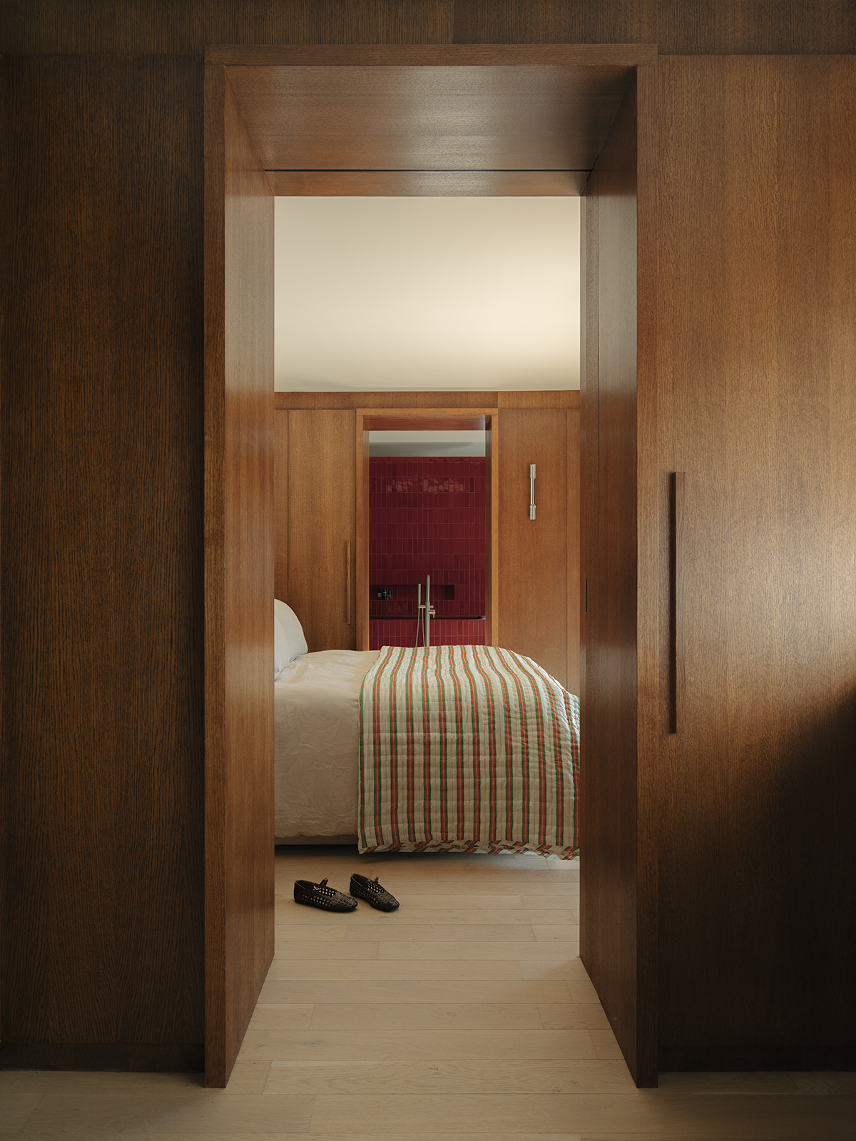 Na piętrze architektki zaplanowały garderobę, dalej sypialnię, a na końcu łazienkę. Ten układ porządkuje codzienność i tworzy wrażenie stopniowania prywatności, bez stawiania oczywistych granic. W tej części domu szczególnie widać, że projekt opiera się na stolarce i na elementach wykonywanych na zamówienie. Drewno wykorzystane do obłożenia ścian sprawia, że drzwi stają się fragmentem ścian, a przejścia są portalami, które kadrują kolejne wnętrza.