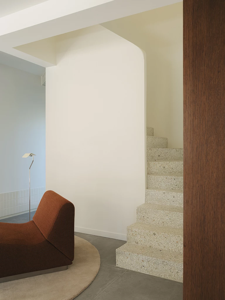 Ważnym elementem tej realizacji jest klatka schodowa. Projektantki postawiły na schody odlane z betonu o ziarnistej fakturze przypominającej terrazzo.