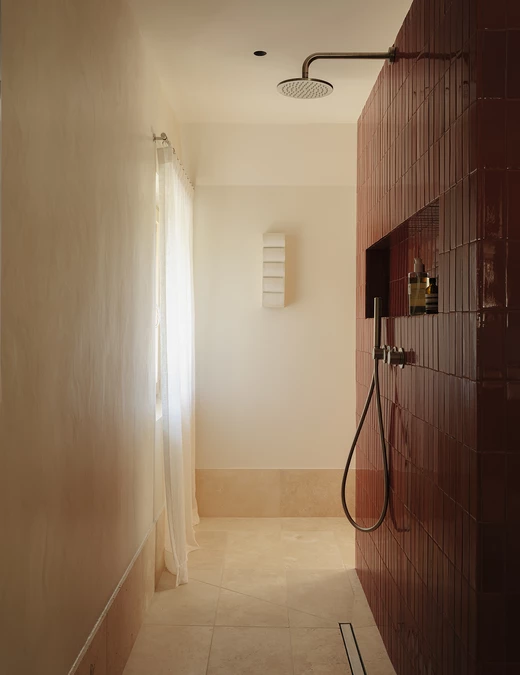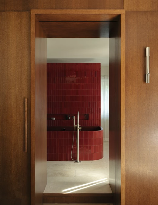 Ogromne wrażenie robi też łazienka. Czerwona ceramiczna zabudowa wanny i prysznica, potraktowana została jako dominanta kolorystyczna i materiałowa. Jej połysk pracuje z otoczeniem, odbija trawertyn, drewno i szczotkowaną stal nierdzewną. To precyzyjnie ustawiony akcent, który spina całą narrację apartamentu i nadaje mu wyraźną tożsamość.