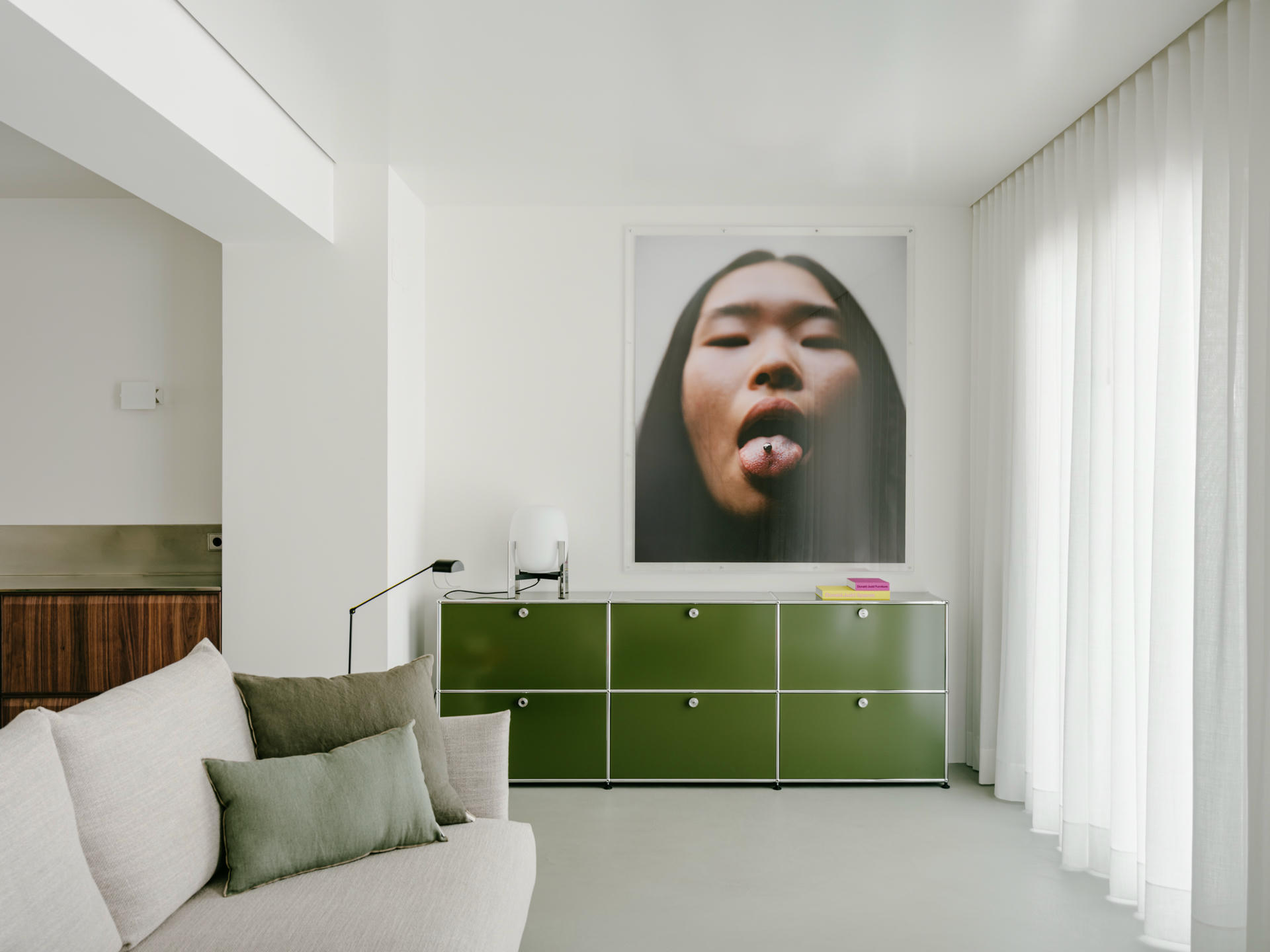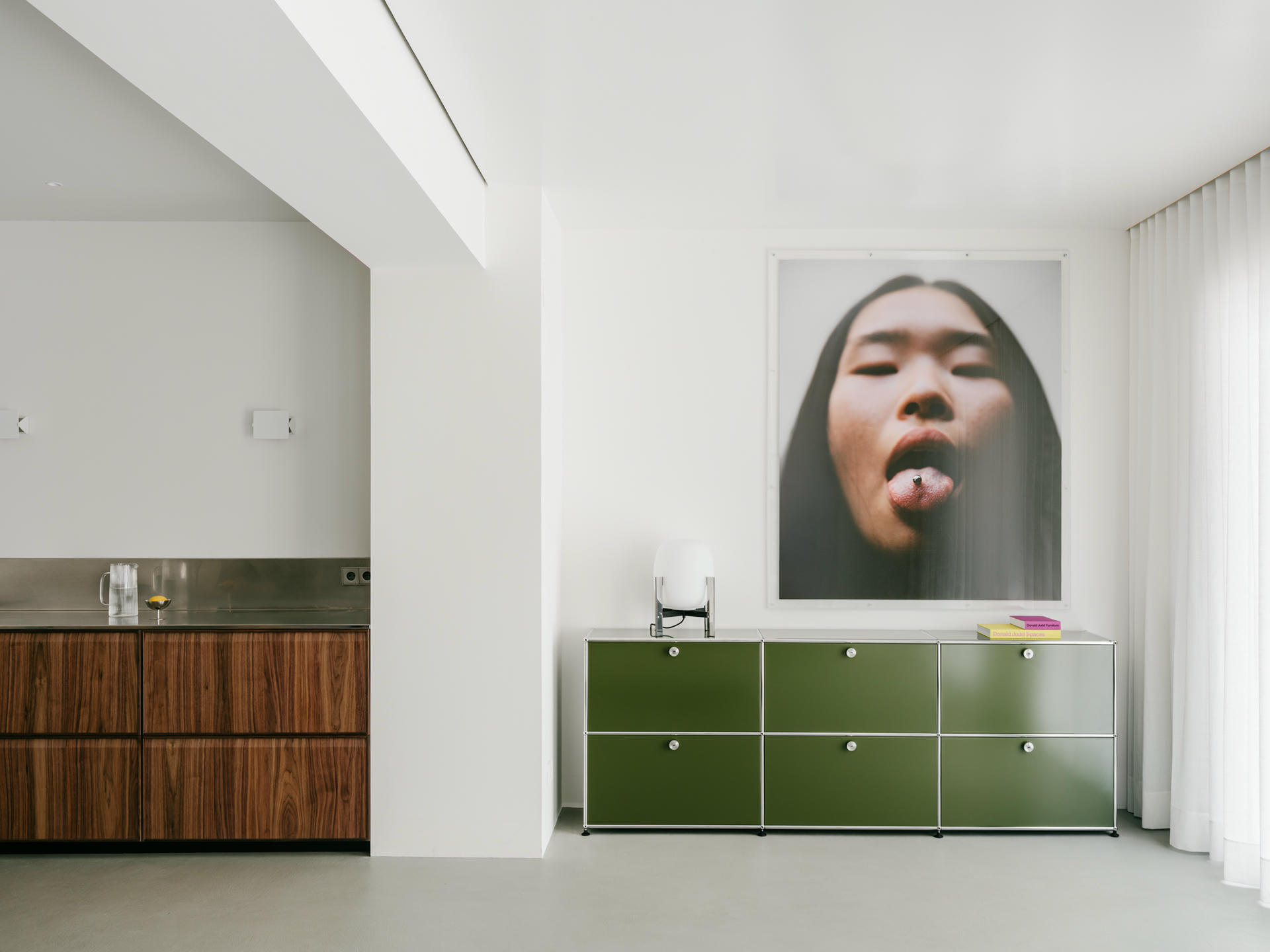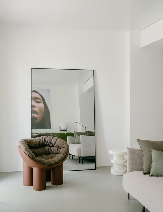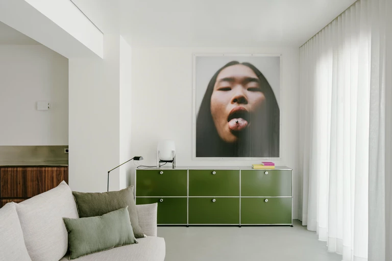 Projekt oparto na bardzo neutralnej bazie. Zrezygnowano z listew przypodłogowych, sztukaterii i zbędnych detali. Wnętrze zostało potraktowane jak czyste tło dla materiałów, koloru i mebli. Inspiracją były elastyczne przestrzenie galeryjne oraz minimalizm charakterystyczny dla twórczości Donalda Judda.
