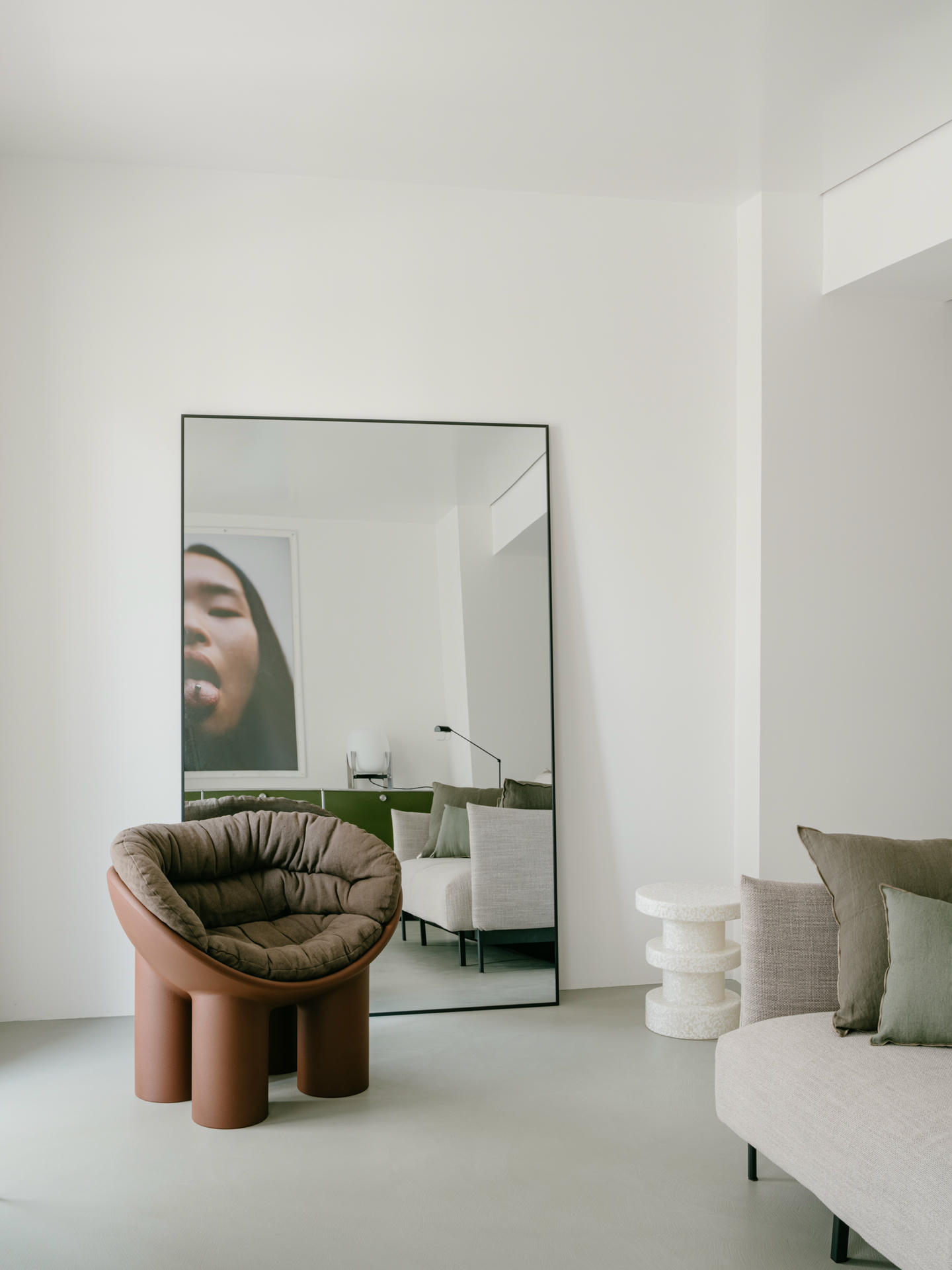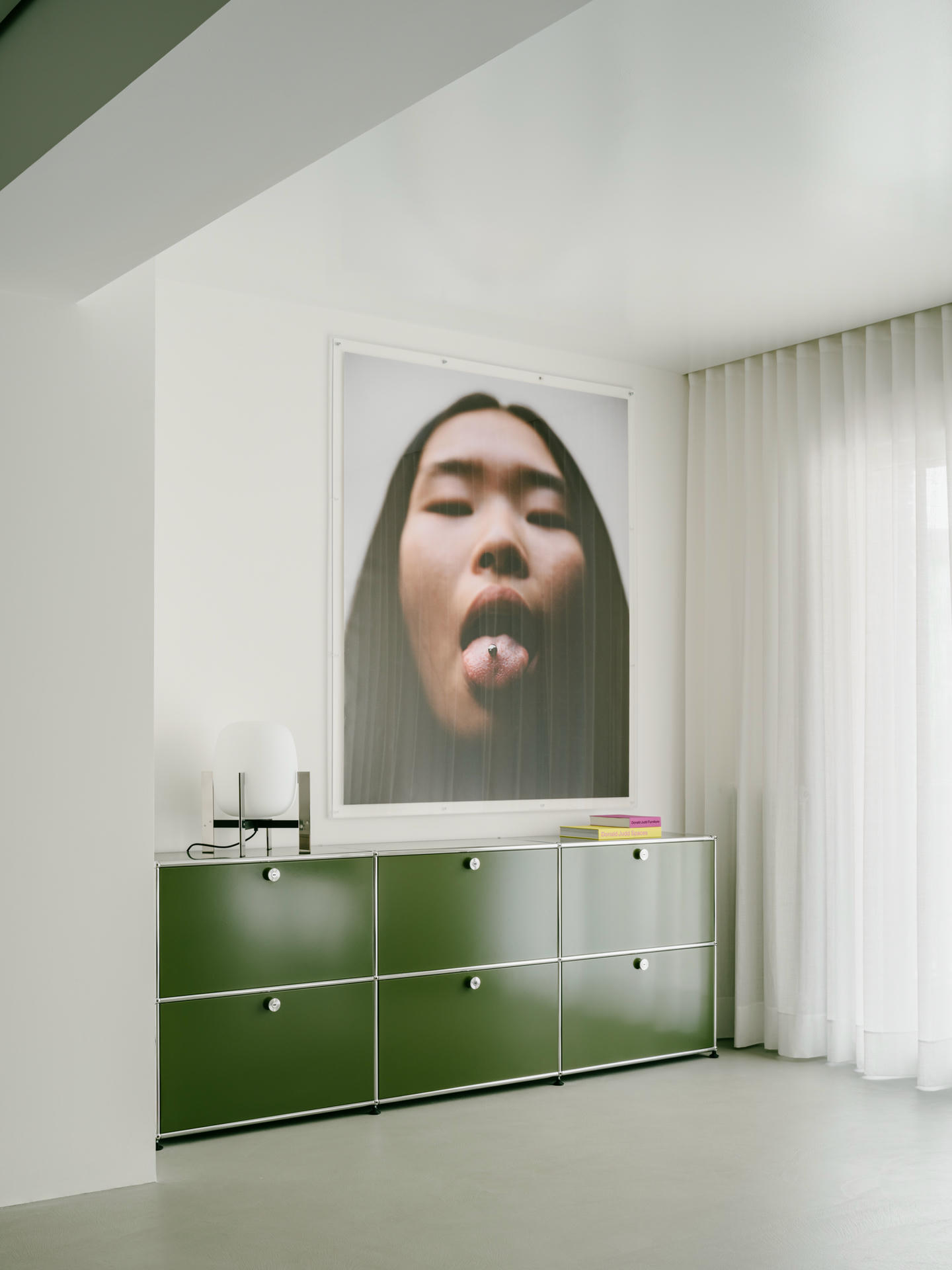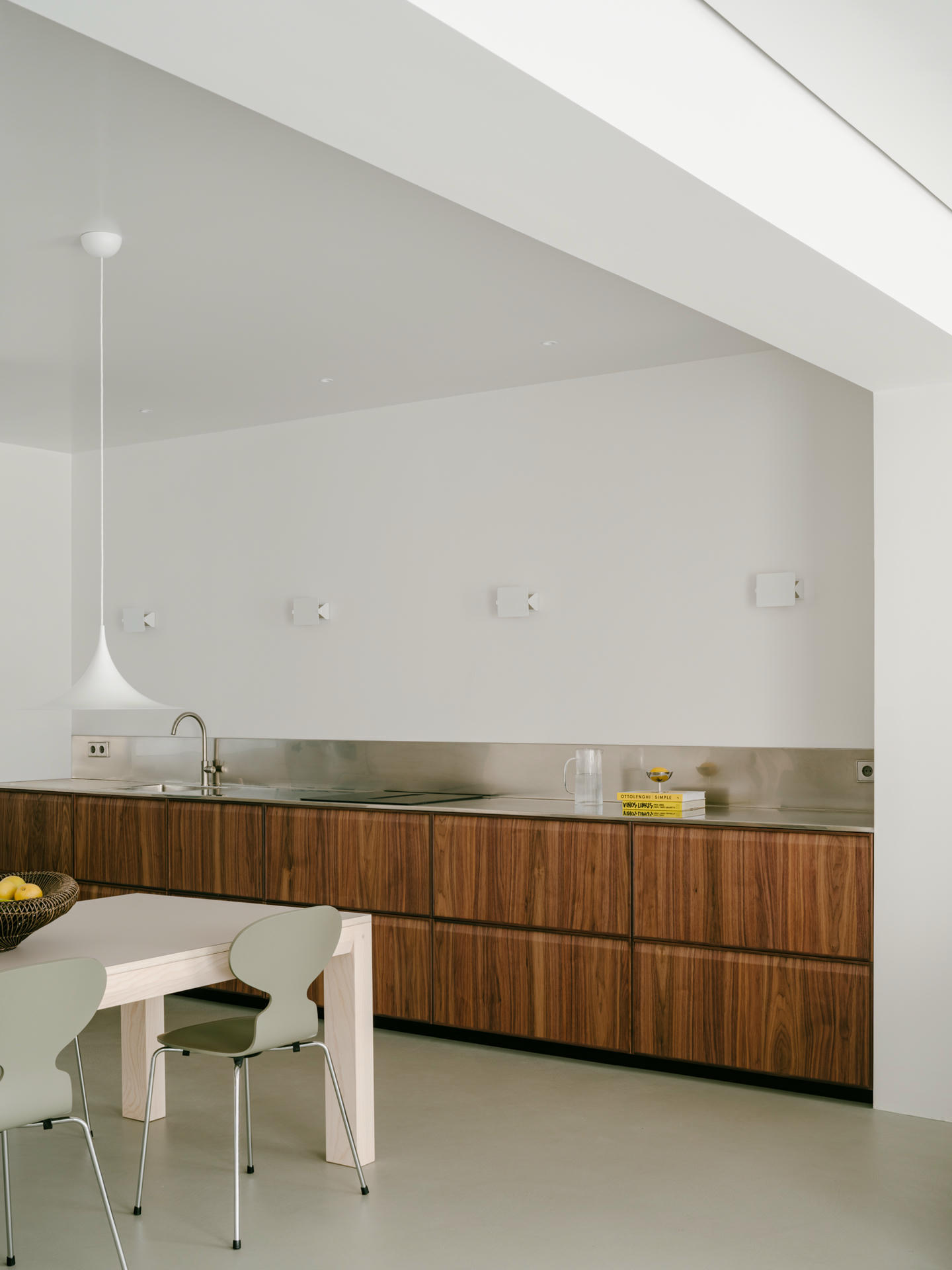Projekt oparto na bardzo neutralnej bazie. Zrezygnowano z listew przypodłogowych, sztukaterii i zbędnych detali. Wnętrze zostało potraktowane jak czyste tło dla materiałów, koloru i mebli. Inspiracją były elastyczne przestrzenie galeryjne oraz minimalizm charakterystyczny dla twórczości Donalda Judda.
