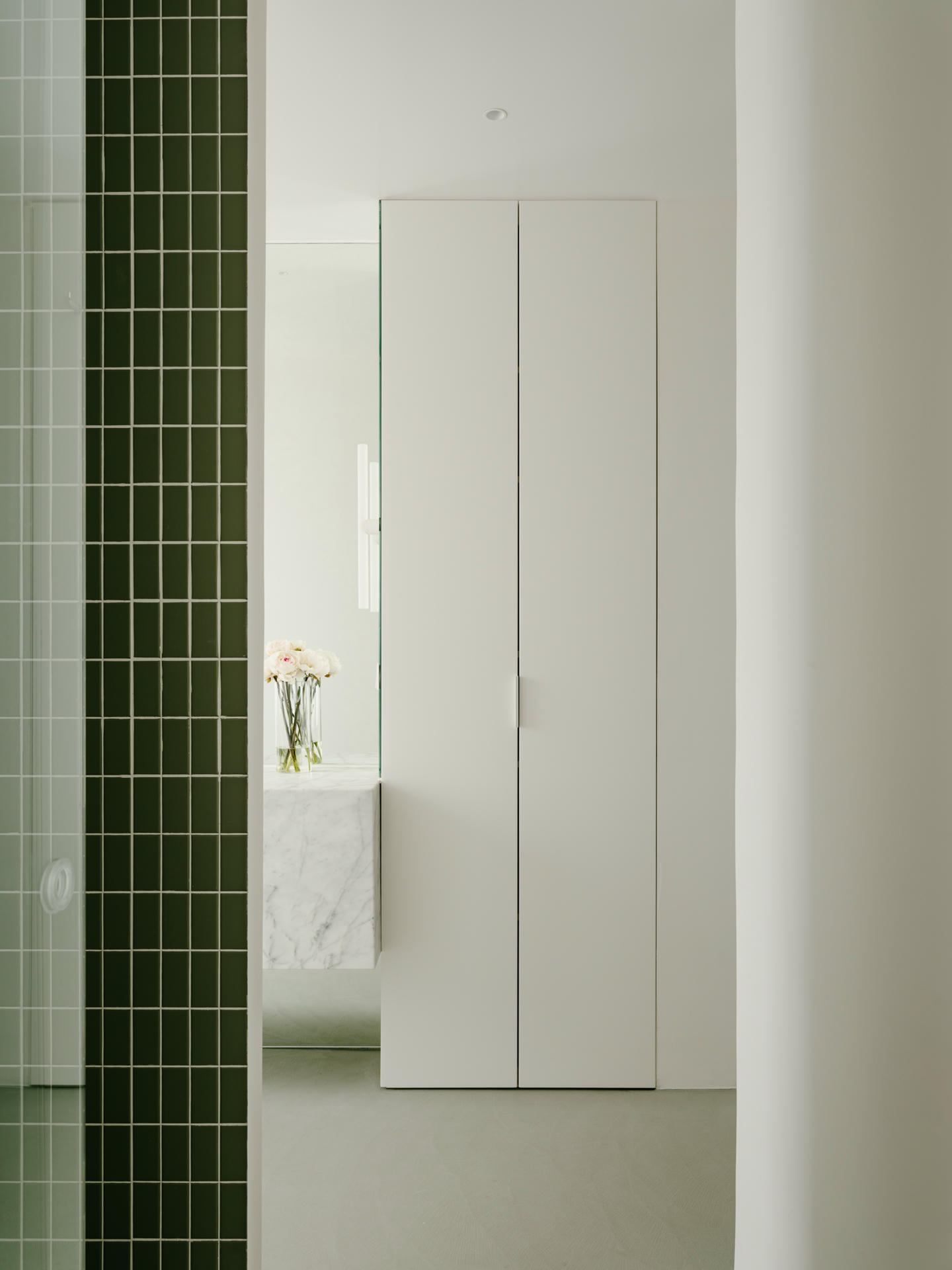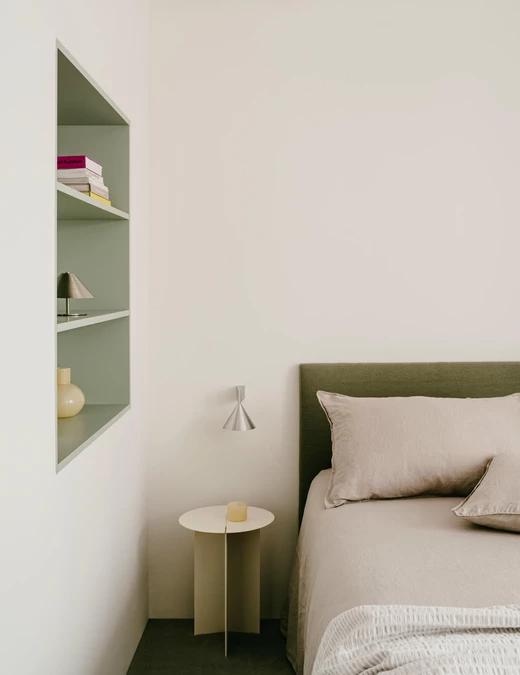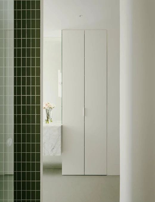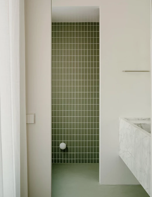 Kolor stał się głównym narzędziem do budowania charakteru. Wybrano zieleń szałwiową – odcień, który w zależności od światła zmienia natężenie i ton. Kolor ten współgra z pozostałymi materiałami: drewnem orzechowym i szczotkowaną stalą nierdzewną w kuchni oraz marmurem w łazienkach.