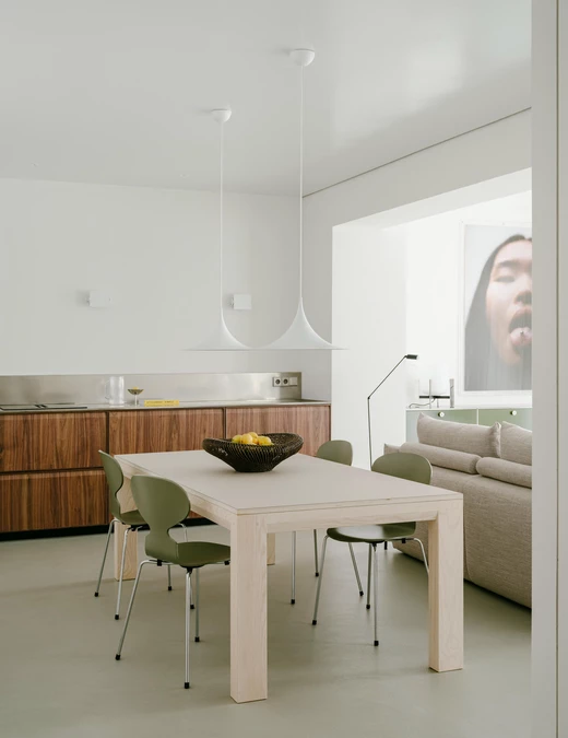 Nowy projekt całkowicie zmienił ten układ. Mieszkanie zostało wyraźnie podzielone na dwie strefy: dzienną oraz nocną. Od strony ulicy powstała otwarta przestrzeń, która łączy kuchnię, jadalnię i salon. Dziś miejsce to stanowi centrum życia domowników. Można stąd przejść na taras i podziwiać widoki na Madryt. Znalazła się tu także toaleta gościnna.