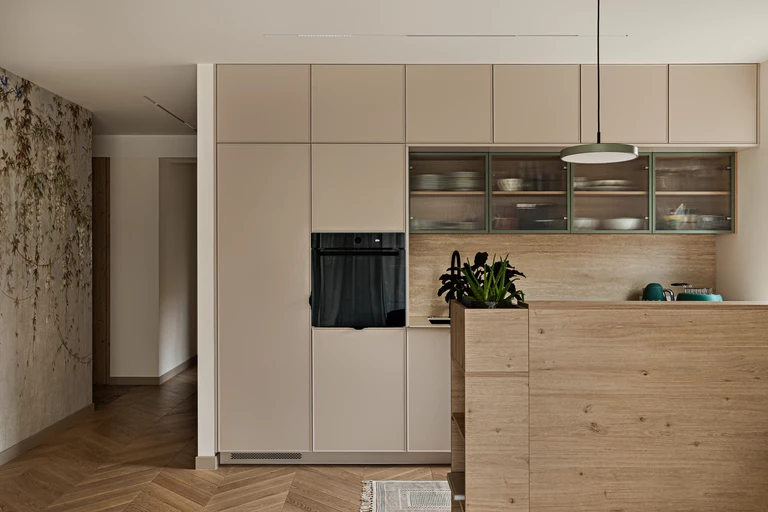 W kuchni dominuje minimalizm i funkcjonalność. Gładkie, matowe fronty szafek w odcieniach beżu i jasnego drewna doskonale komponują się z blatami z naturalnego kamienia o surowej fakturze betonu. Wbudowane sprzęty AGD oraz delikatne uchwyty podkreślają jednolitą, nowoczesną stylistykę.