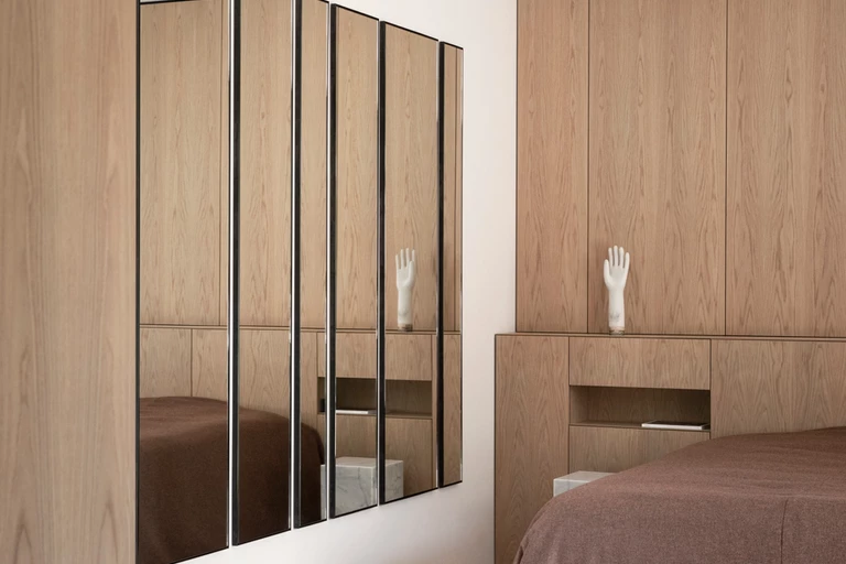 Wnętrze jest z kolei bardzo eleganckie i minimalistyczne. Cały kunszt projektu widoczny jest w starannie przemyślanych detalach, takich jak łączenie marmurowego blatu z ryflowanymi frontami szafki. Zdecydowano się na stonowaną paletę kolorów opartą na naturze: od delikatnych beżów, aż po ciemny brąz naturalnej skóry.