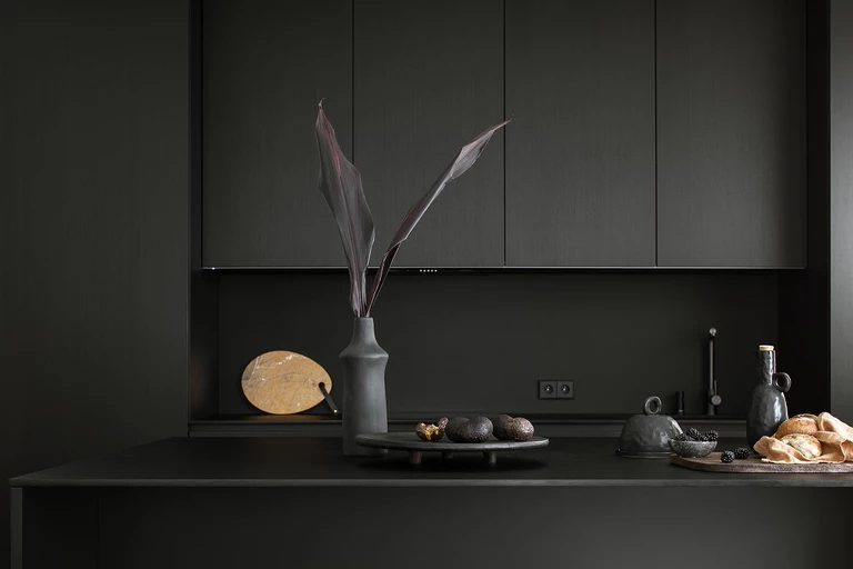 Bardzo szybko znalazły wspólny język z właścicielami – wielbicielami nowoczesnych rozwiązań i dizajnu z najwyższej półki – i dostały wolną rękę w projektowaniu ich 90-metrowego mieszkania. Architektki zaczęły od modyfikacji układu funkcjonalnego, tak aby uzyskać jak największą przestrzeń części dziennej. W tym celu wyburzono wszystkie istniejące ściany działowe i postawiono je na nowo. Nowy układ zakładał też rezygnację z jednego pokoju oraz jednej z łazienek. Modyfikacji uległ też projekt kuchni, która z odrębnego pomieszczenia zmieniła się w aneks w części dziennej. Właściciele, niezbyt często gotujący, przystali na bardzo minimalistyczne założenie dotyczące aneksu – ukrycie większości sprzętów i wyposażenia, wizualne oddzielenie strefy kuchennej wyspą z wysokimi hokerami oraz położenie nacisku na eleganckie, ciemne wykończenie. Zabudowę kuchenną wykończono fornirem, a ścianę nad cienkim, kompaktowym blatem przykryto taflą matowego szkła, tworzącą z frontami szafek wizualną całość.