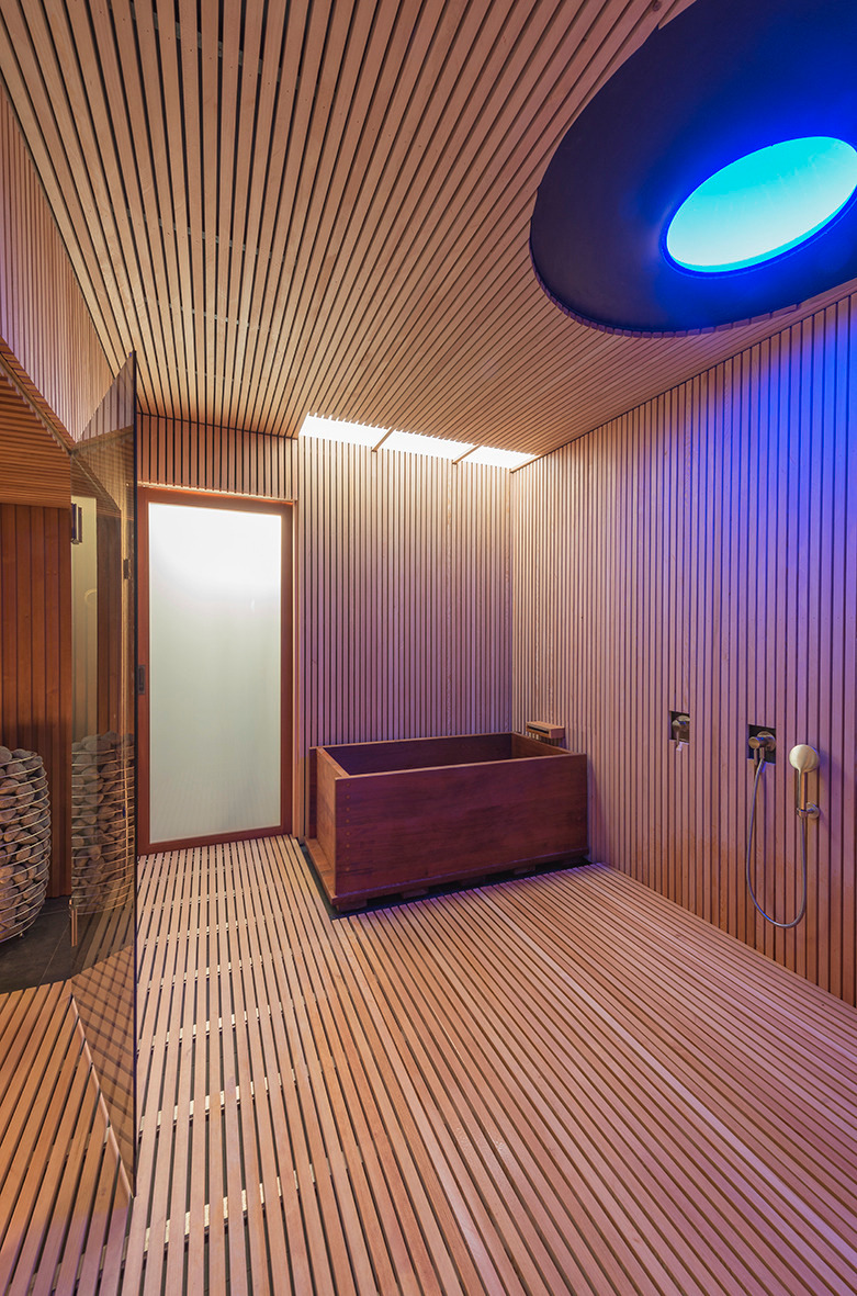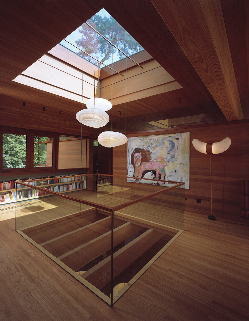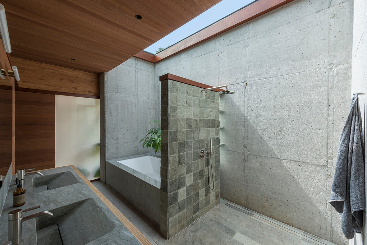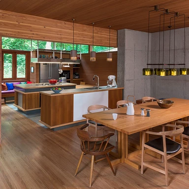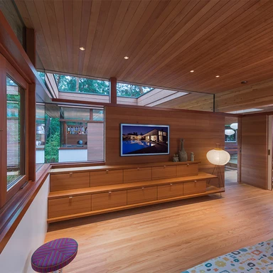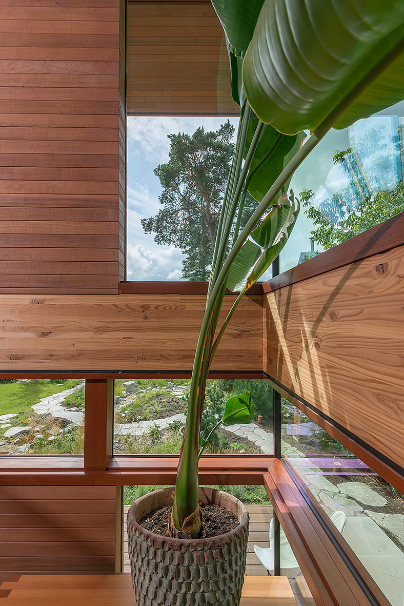 Fasada budynku, wyłożona daglezją i sekwoją kalifornijską, dyskretnie wtapia się w otaczający las. Zastosowanie prefabrykowanych ścian pozwoliło na zachowanie czystości formy, tak charakterystycznej dla modularnych systemów, nad którymi Kappe pracował przez lata.
