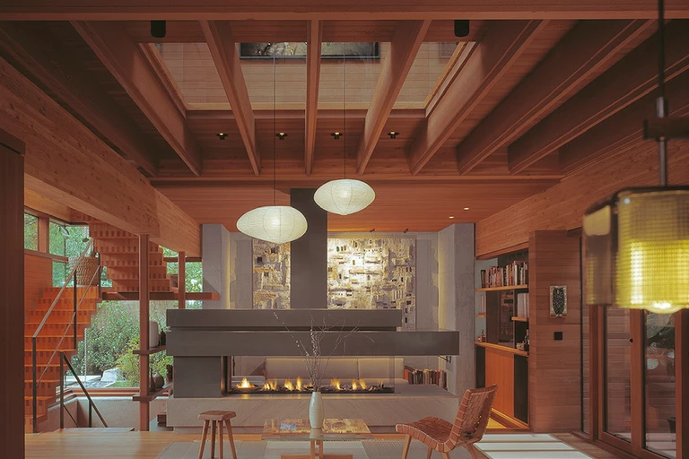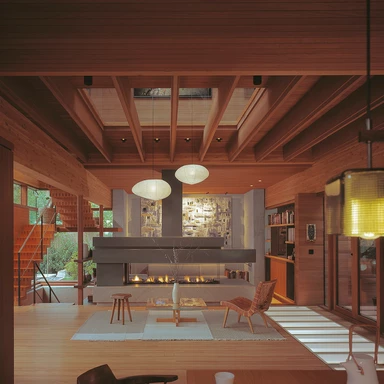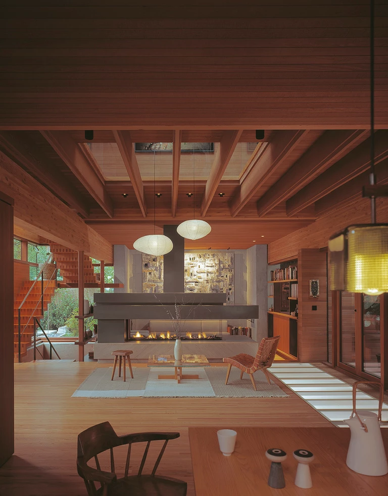 Wnętrza wypełnia ciepło naturalnego drewna i ogromne tafle szkła, które sprawiają, że ogród staje się integralnym elementem salonu. Tektonika bryły, z jej wysuniętymi tarasami i nadwieszeniami, nawiązuje bezpośrednio do słynnej konstrukcji słupowo-ryglowej, którą Kappe doprowadził do perfekcji w swoich kalifornijskich projektach.