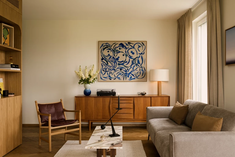 To wnętrze jest spotkaniem mebli projektowanych na wymiar z klasykami designu, sztuką współczesną i wysmakowanymi elementami vintage. W jadalni odnaleźć można krzesła Audo Copenhagen zestawione ze stołem vintage wyszukanym na Pamono oraz lampą Gervasoni. Ważną rolę pełnią również dzieła sztuki – obraz Grzegorza Jarzynowskiego i kolaż Mikołaja Moskala, a także prace Soni Dubois w sypialni.
