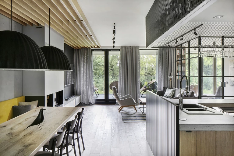 Zmiana funkcji dwóch pomieszczeń, usunięcie kilku ścian działowych i wstawienie w ich miejsce przeszklonych drzwi loftowych, otworzyło salon i kuchnię na panoramiczny widok natury za oknem. Teraz natura jest nieodłącznym uczestnikiem codziennego życia, czy też zmieniającym się o każdej porze roku obrazem widzianym z wnętrza.