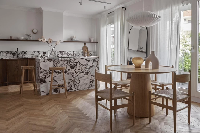 W tym mieszkaniu na warszawskim Wilanowie główną rolę gra marmur Calacatta Viola, którym wykończono wyspę kuchenną, blaty oraz pas ścienny. W połączeniu z frontami z orzecha amerykańskiego tworzy harmonijną kompozycję. Autorkami projektu wnętrza są Daria Wachowicz z pracowni Dash Interiors i Martyna Duch-Kupis.