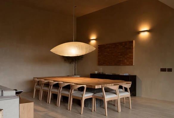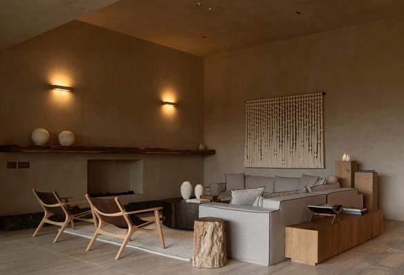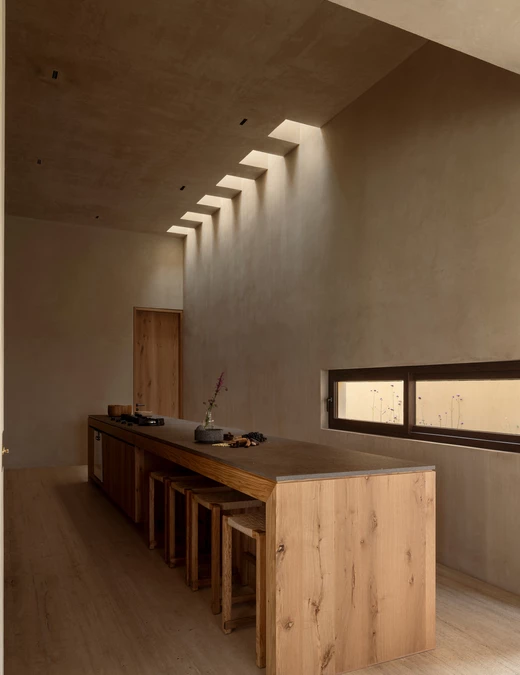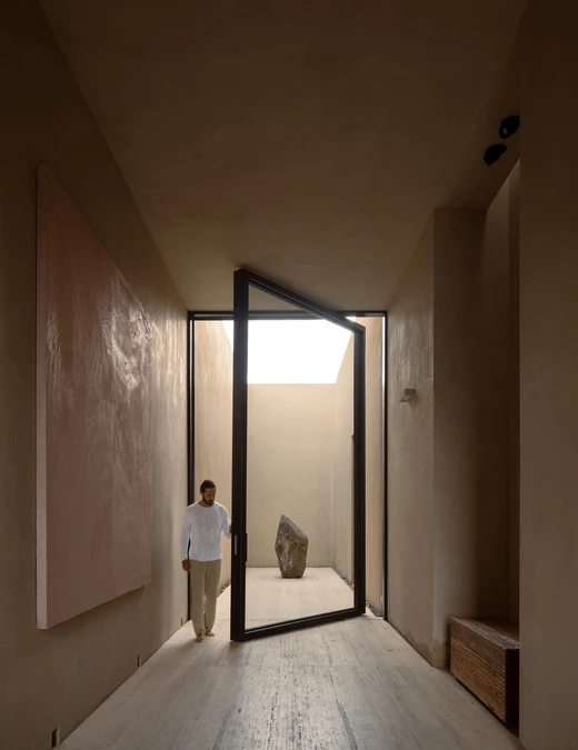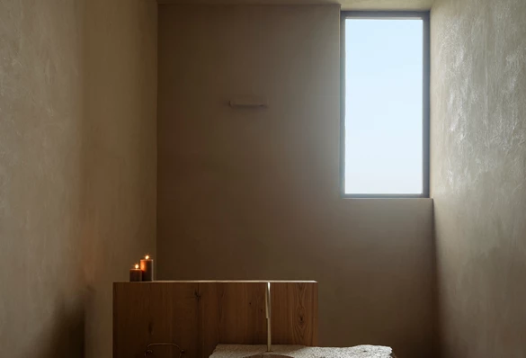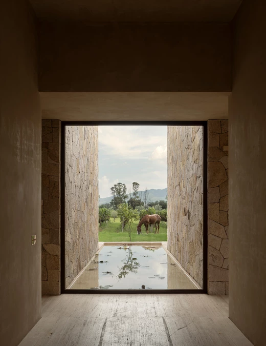 Dominującym materiałem jest kamień pozyskany z pobliskiego stanowiska. Na podłogach zastosowano niepolerowany meksykański marmur. Ściany pokryto ręcznie nakładaną farbą wapienną, w odcieniu idealnie dopełniającym naturalny kolor kamienia. Efektem są monochromatyczne monolity, surowe i spokojne.