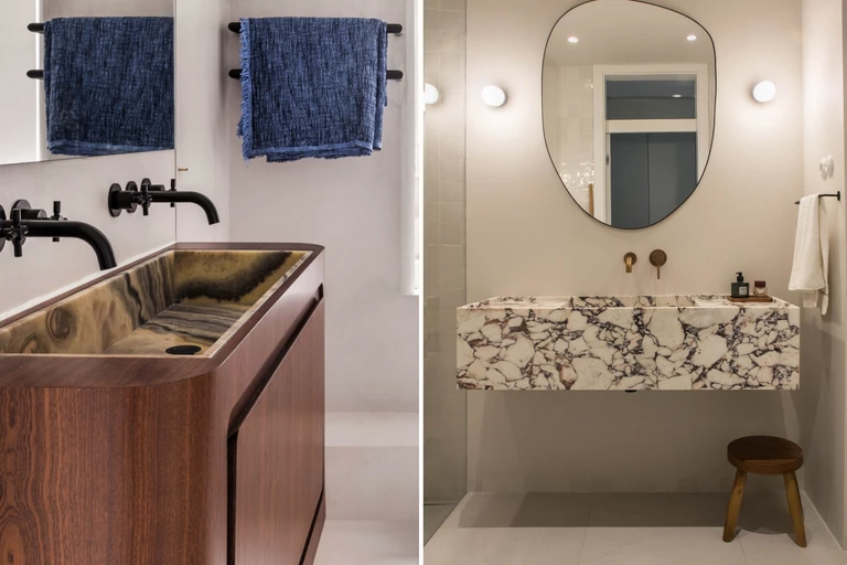 Umywalkę z onyksu projektantki z Batiik Studio „schowały” w zabudowie drewnianej szafki, a jej brzeg zlicowały z rantem mebla.