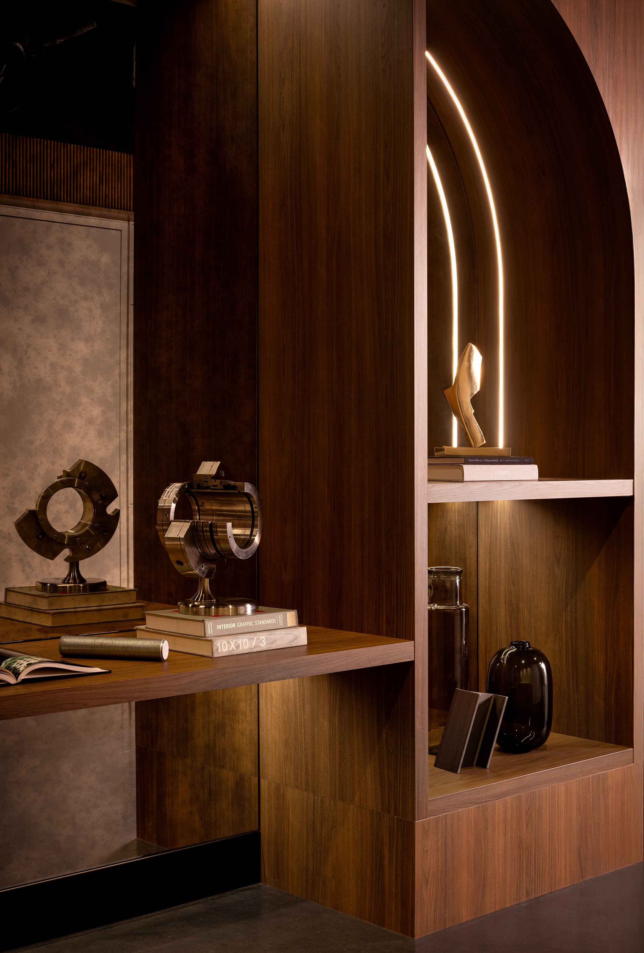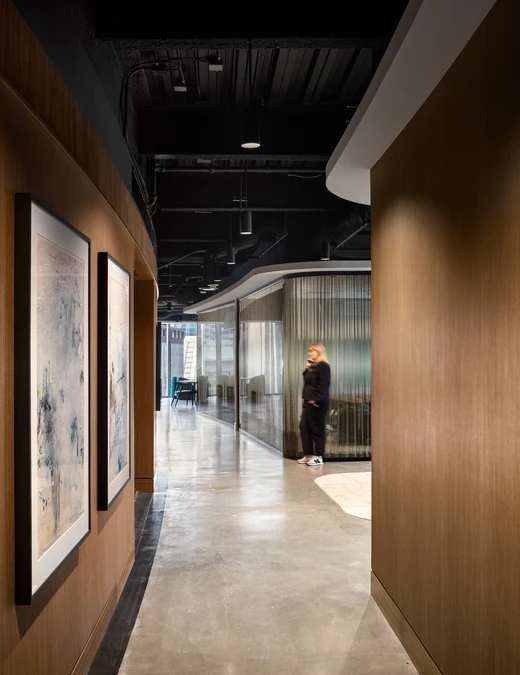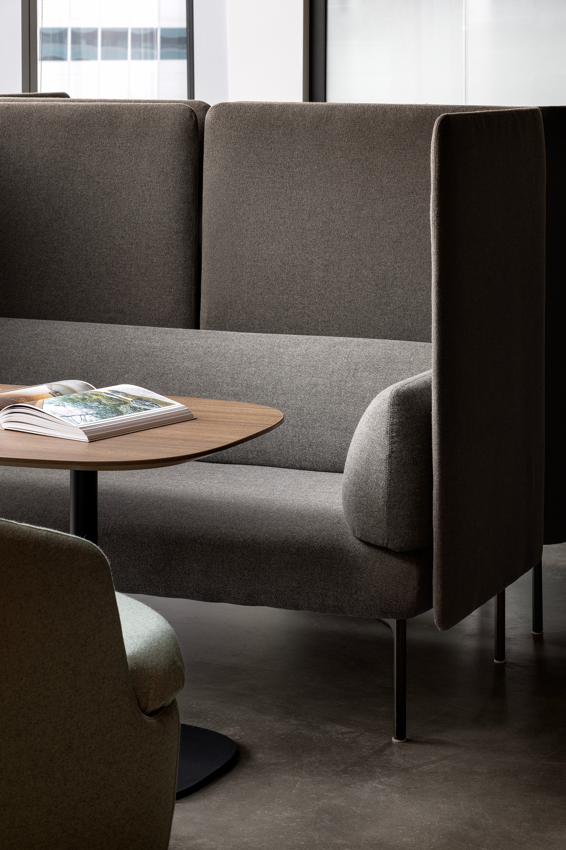 Rezultatem jest ciepłe, wyrafinowane i skoncentrowane na człowieku środowisko. Surowa geometria wieżowca została celowo złagodzona przez łukowate, przeszklone ściany i wykończenia z naturalnego drewna. Dwutonowe betonowe posadzki subtelnie nawiązują do architektury budynku, jednocześnie ocieplając wnętrze.