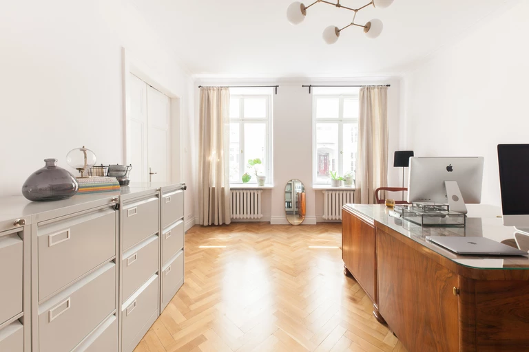 W pokoju będącym biurem właścicielek kancelarii projektantki połączyły ze sobą elementy tradycyjne i współczesne. Klasyczne biurka art deco, znalezione na warszawskich targach antyków oraz vintage krzesła z odważną fuksjową tapicerką nadają pomieszczeniu wyrafinowania. Z kolei ponadczasowe i funkcjonalne gabloty oraz neutralne szafki na liczne akta wprowadzają nutkę nowoczesności. Dominują tu spokojne beże i brązy, uzupełnione soczystą zielenią roślin na parapetach.