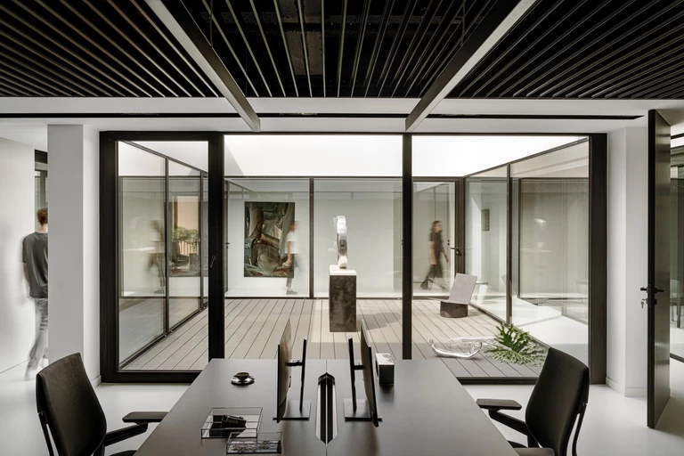 Bryła budynku, z wielkoformatowymi przeszkleniami, idealnie wpisuje się w monochromatyczną estetykę wnętrz. Białe ściany i podłogi kontrastują z czarnymi, rastrowymi sufitami oraz subtelnym oświetleniem, co tworzy elegancką i harmonijną przestrzeń. Przeszklenia otwierają wnętrze na patio, pozwalając na przenikanie naturalnego światła, które nadaje wnętrzu spokojny, wyciszający charakter.