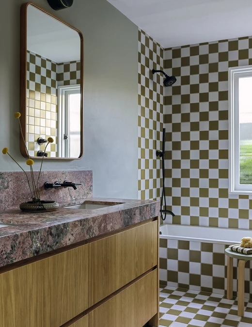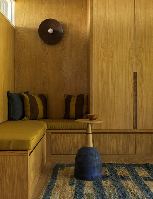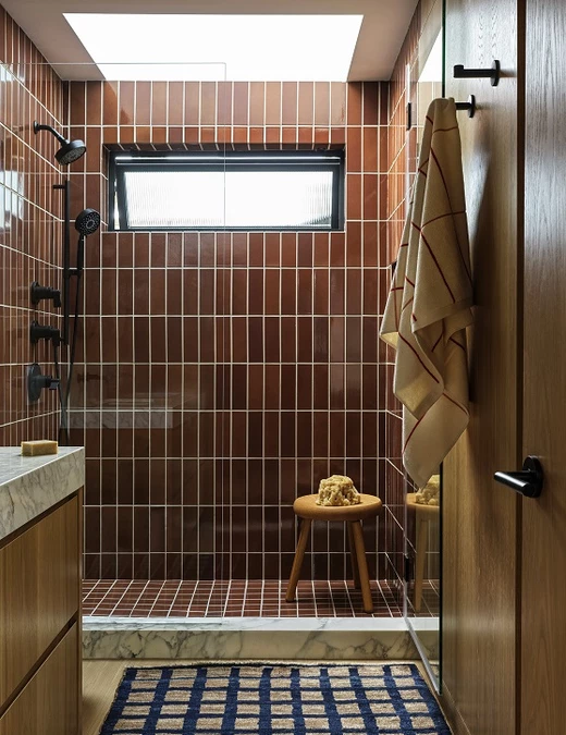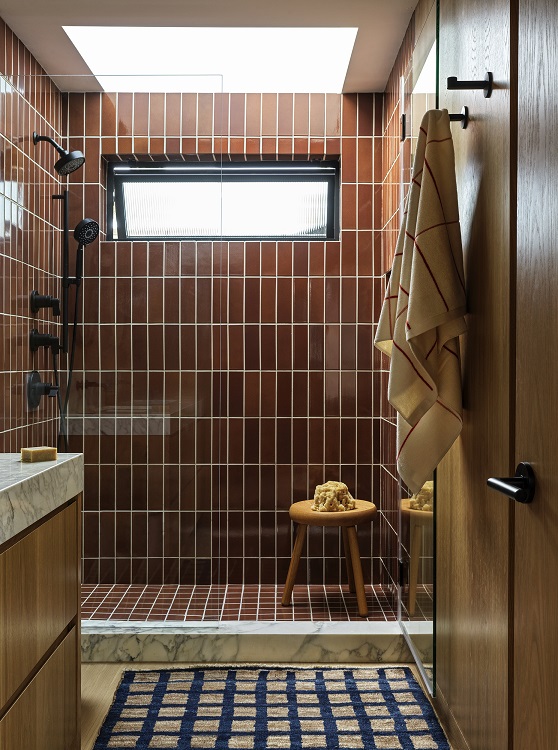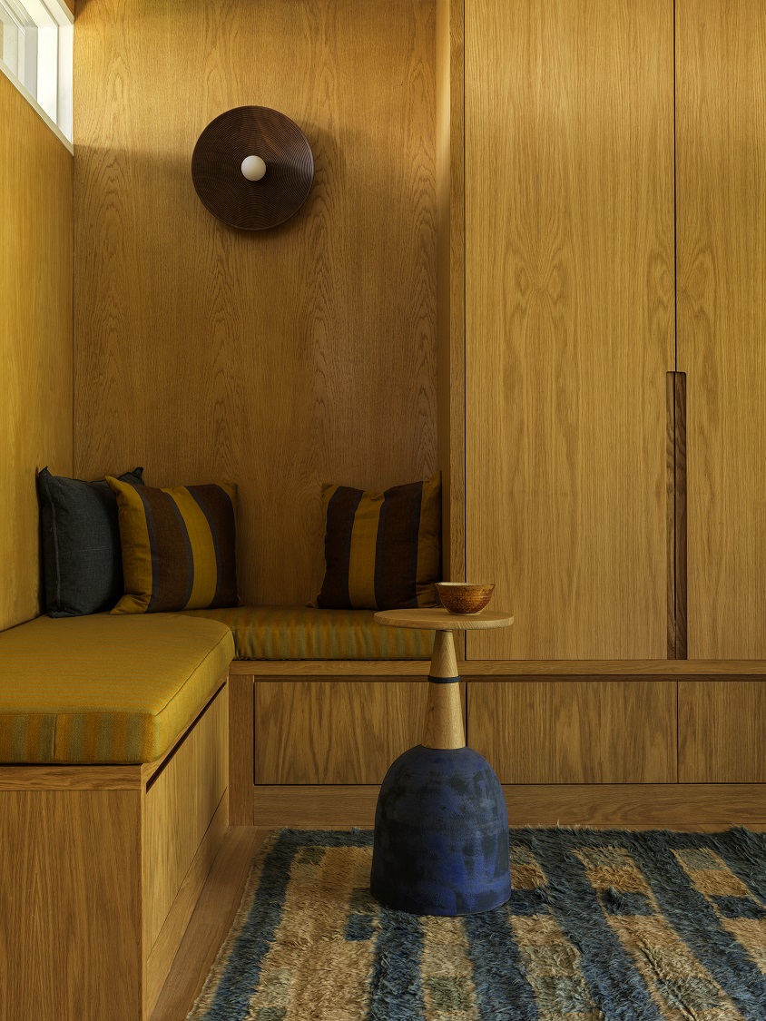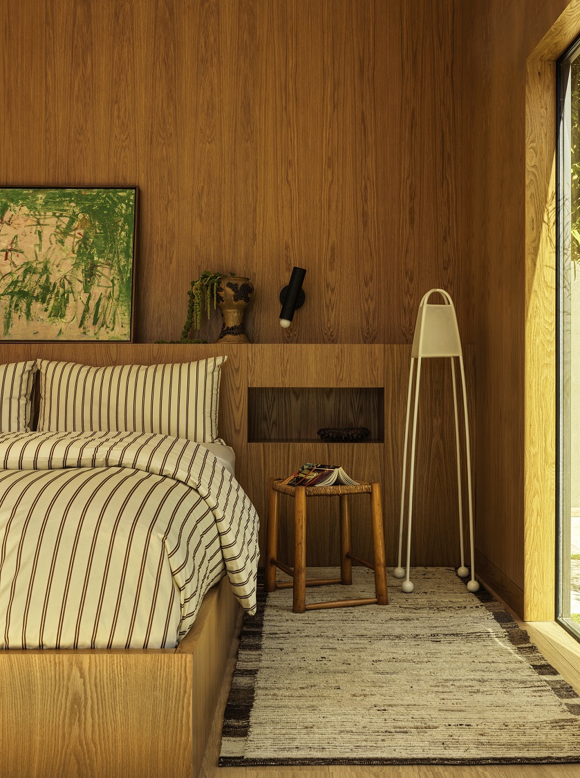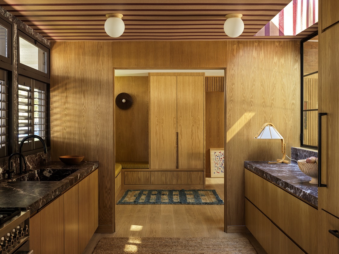 Przebudowa miała na celu uporządkowanie układu i wprowadzenie światła do wnętrz. Główna sypialnia została przeniesiona od strony ulicy na tyły domu, gdzie poranne światło przebija się przez zieleń ogrodu. Między pokojami dzieci powstała łazienka z podwójnym wejściem, a po przeciwnej stronie dodano pokój pełniący funkcję biura lub sypialni gościnnej.