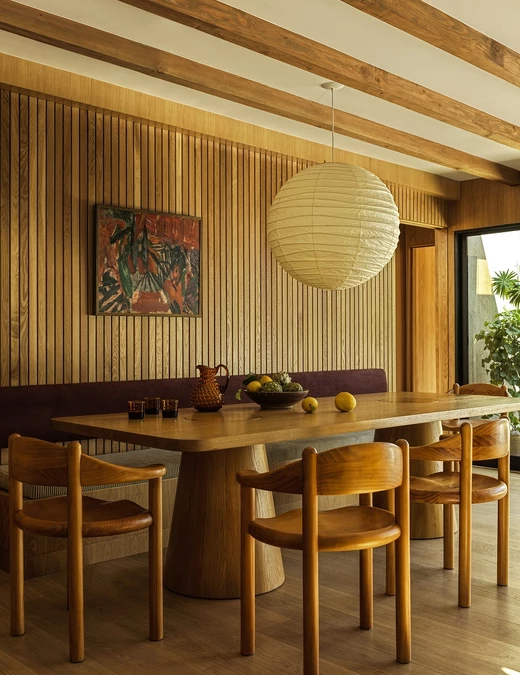 Centralnym punktem stała się otwarta strefa dzienna – kuchnia i salon, w których skupia się codzienne życie. Jasne wnętrza, miękkie tony drewna i prosta geometria brył przywracają dawną lekkość modernizmu, a jednocześnie nadają domowi przytulności.