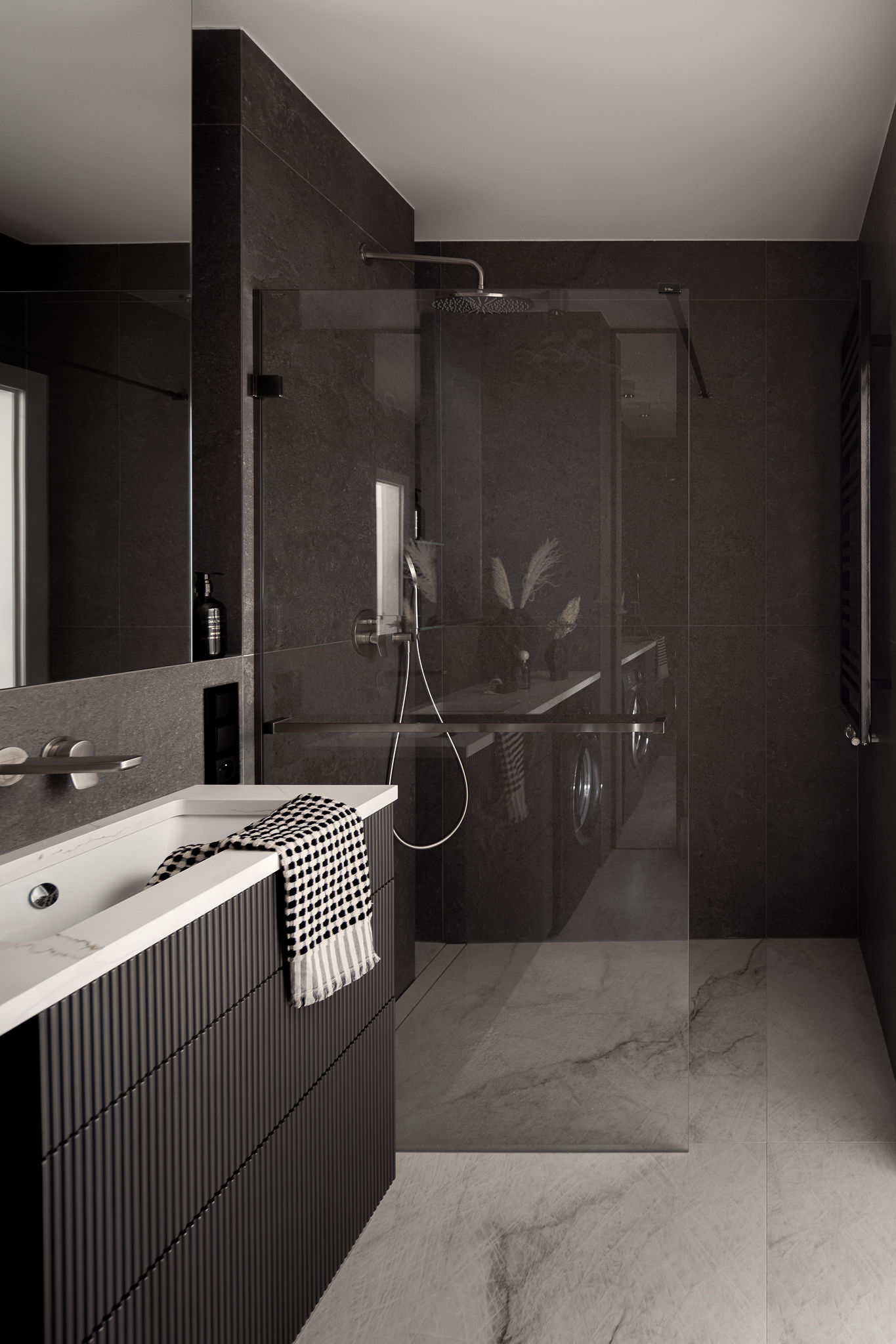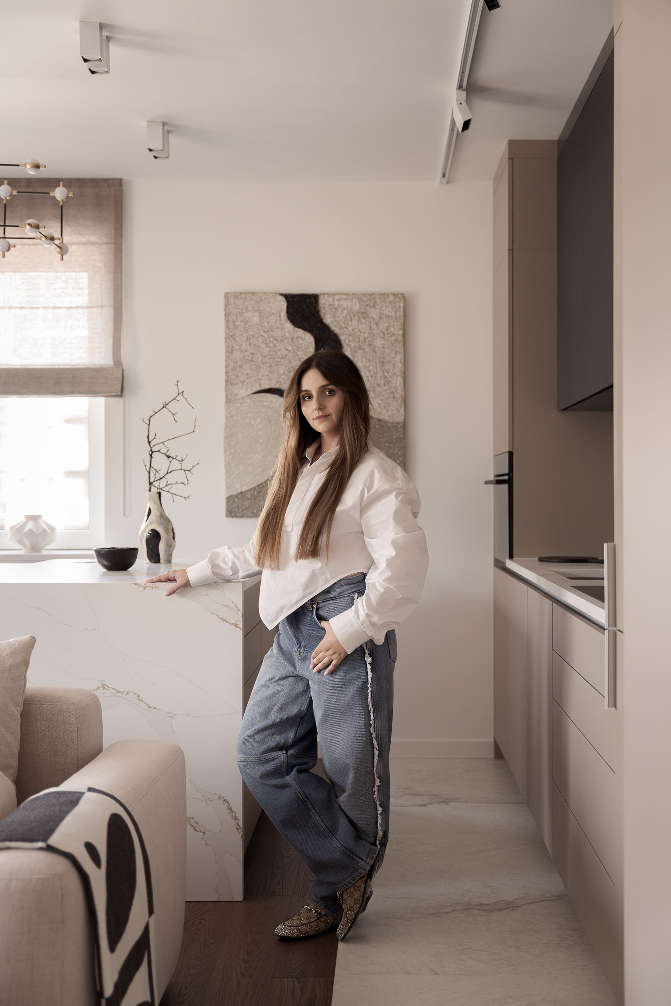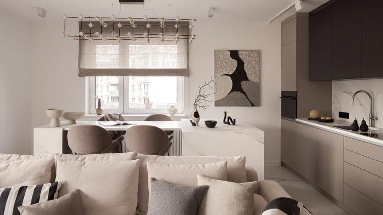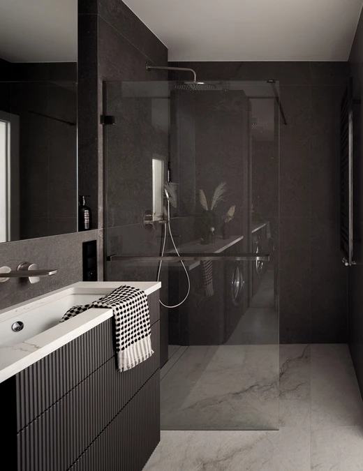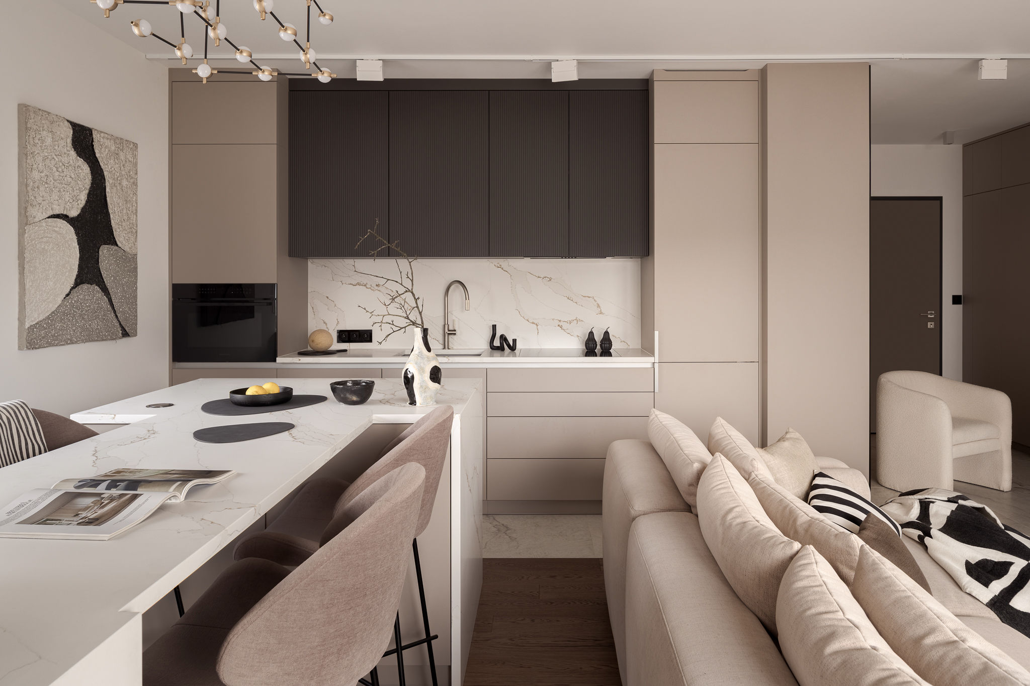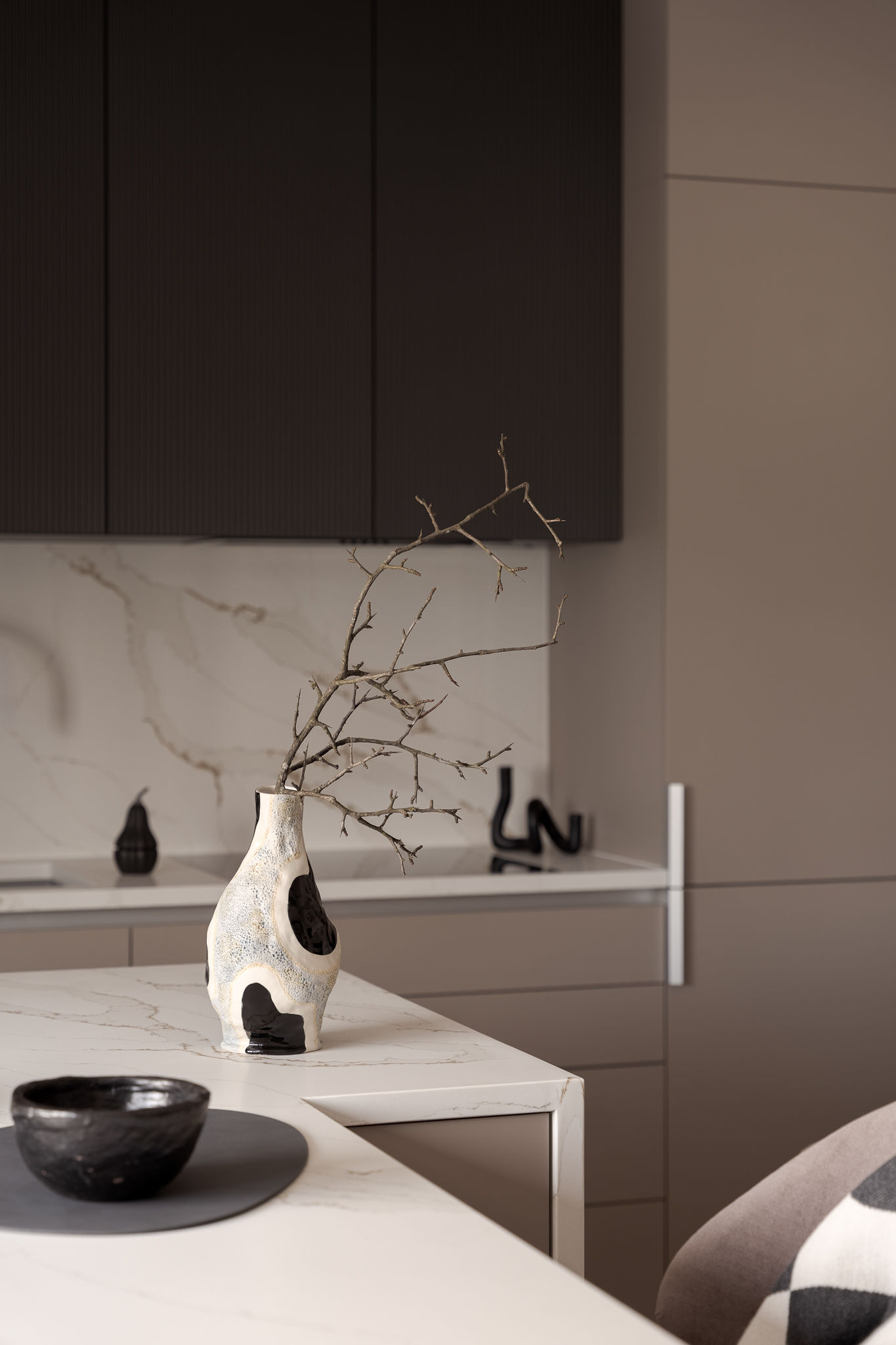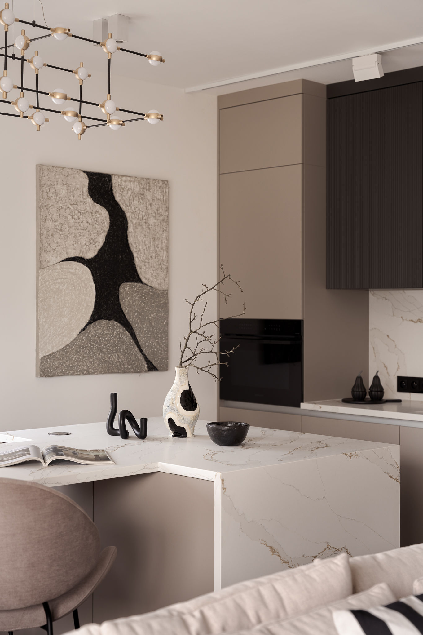 Fundamentem tej realizacji jest paleta barw, która bazuje na subtelności kaszmirowego beżu. To on stanowi tło dla silniejszych akcentów – szkliście białego kwarcytu oraz ciemnoszarego łupka.