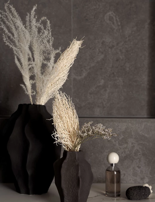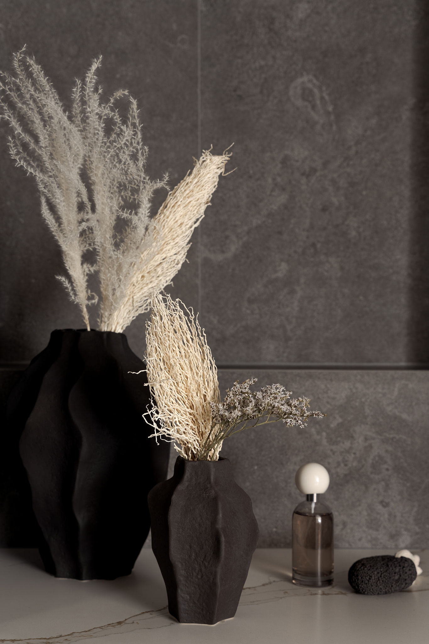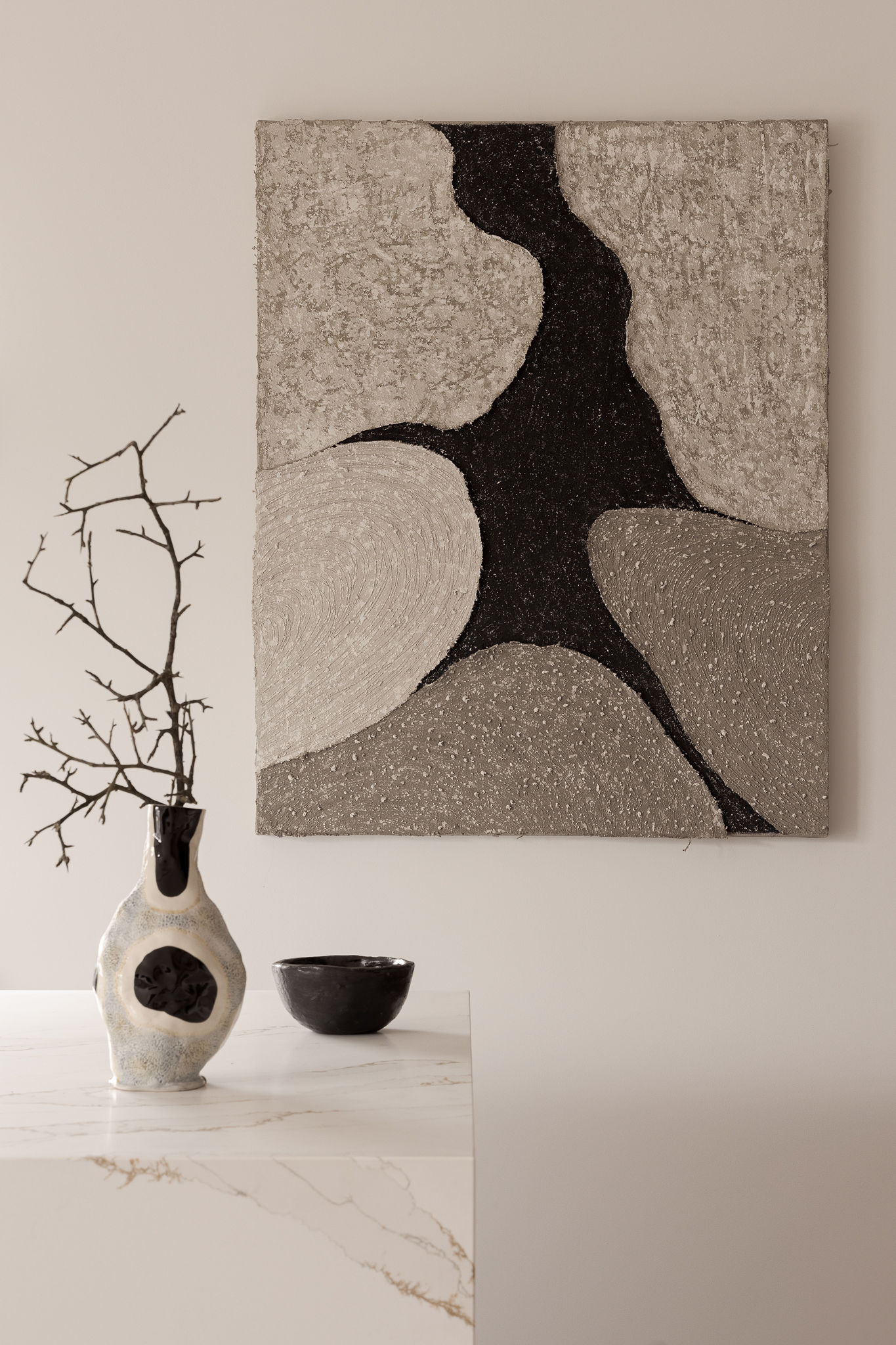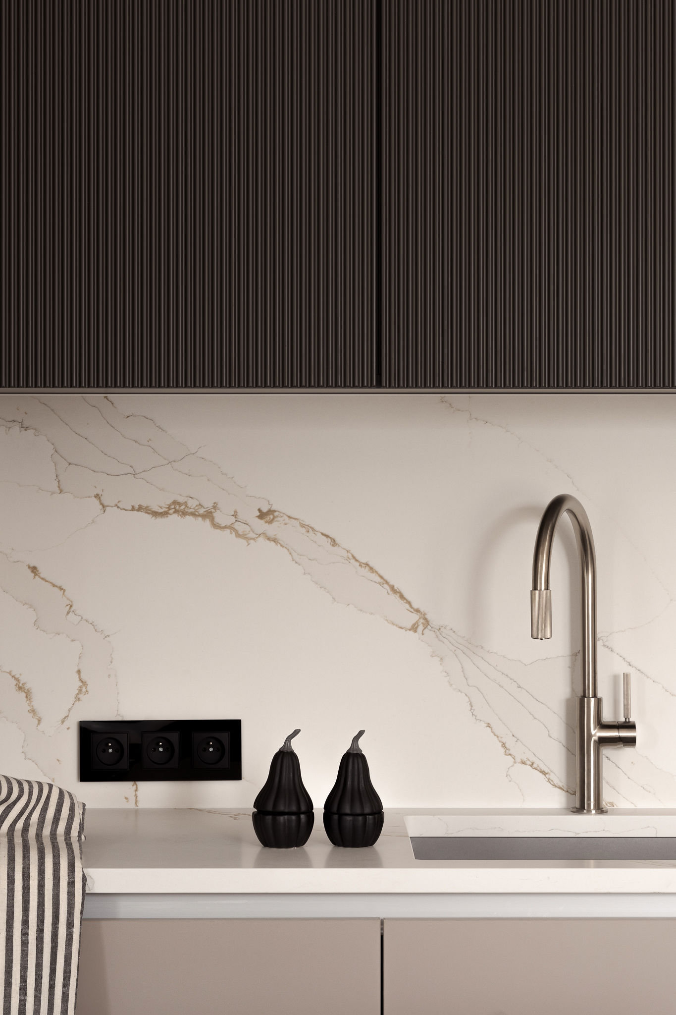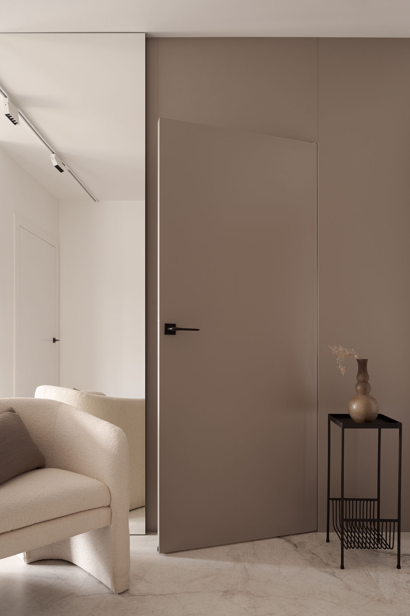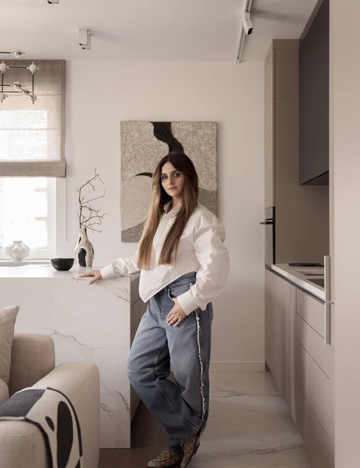 Fundamentem tej realizacji jest paleta barw, która bazuje na subtelności kaszmirowego beżu. To on stanowi tło dla silniejszych akcentów – szkliście białego kwarcytu oraz ciemnoszarego łupka.