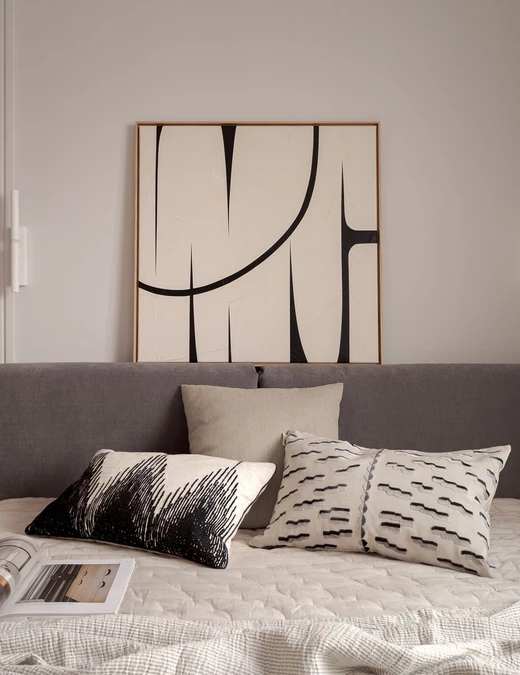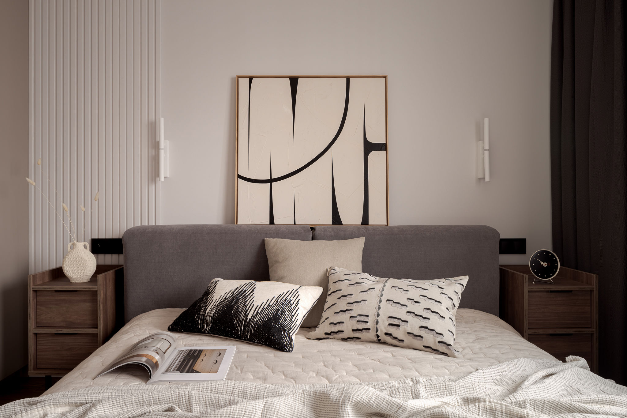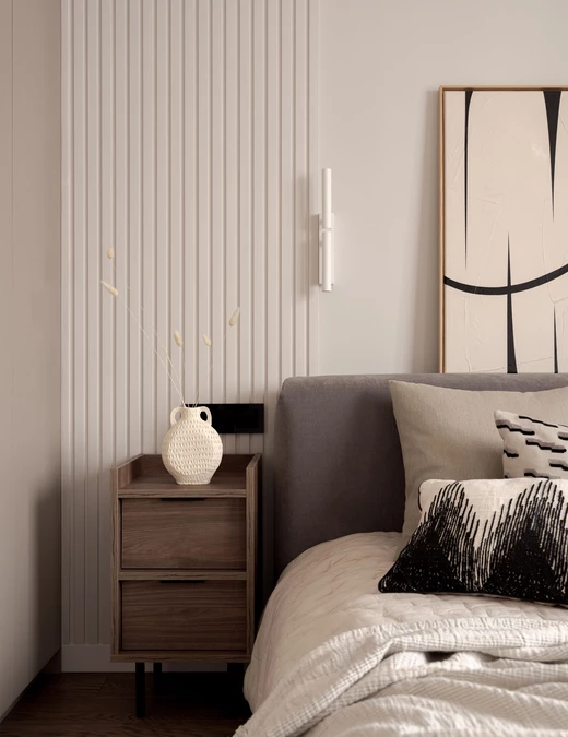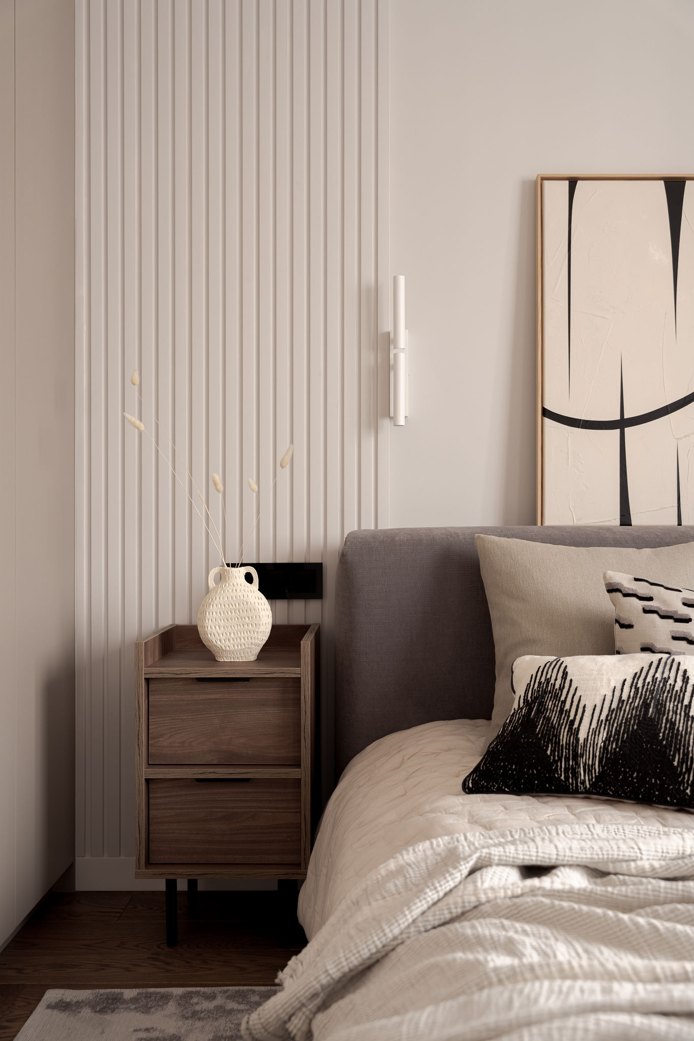 Sypialnia kontynuuje narrację spokoju. Nad łóżkiem zawisł obraz Evy Jablonsky, który skupia wzrok i spina aranżację, korespondując z oświetleniem Italux oraz lampką Comforty, czerpiącą z najlepszych wzorców marki Flos. Każdy element, od hokerów Iker po osprzęt Karlik, został tu dobrany z myślą o spójności estetycznej.