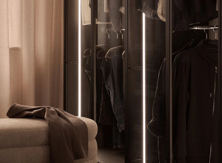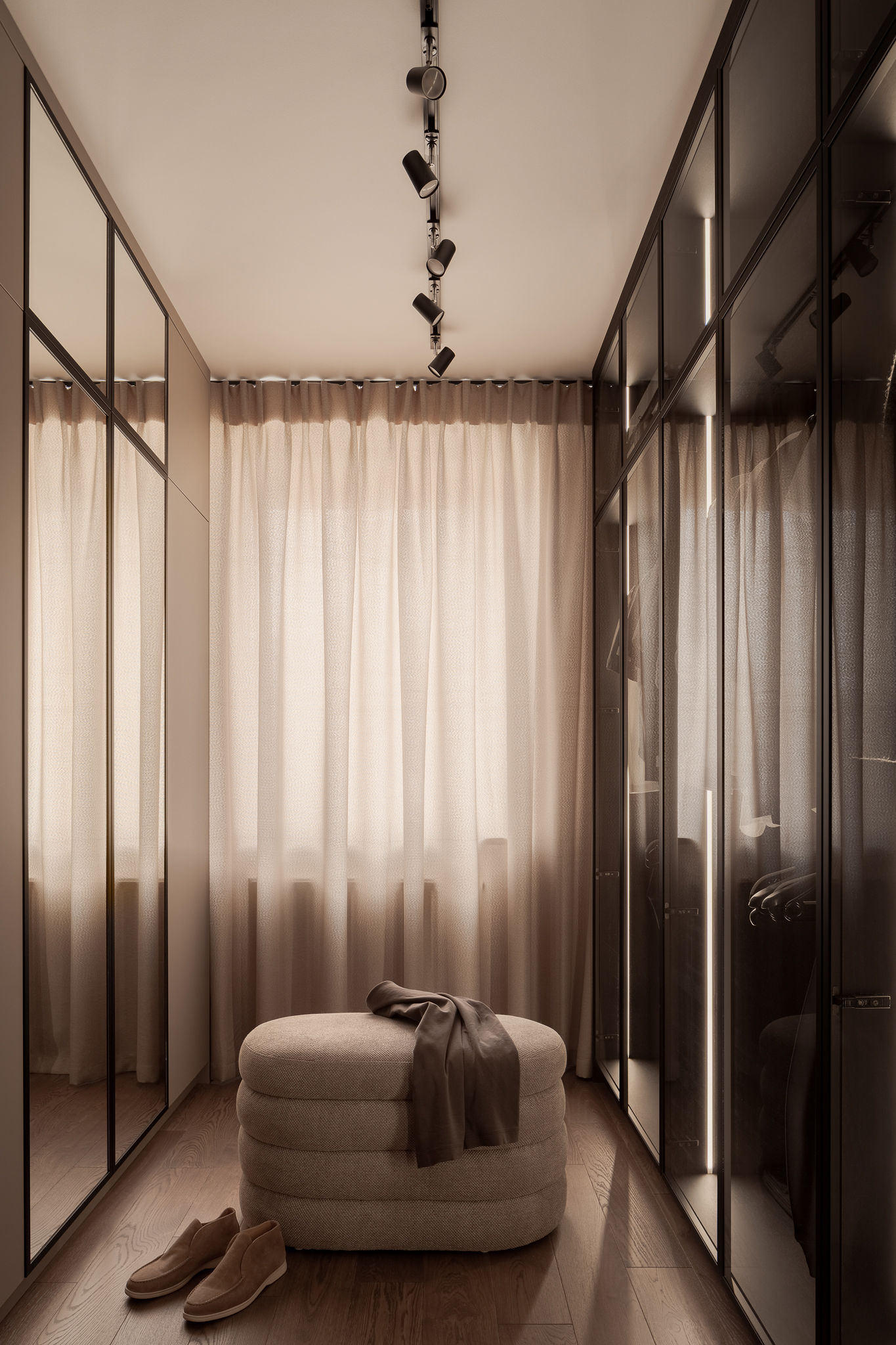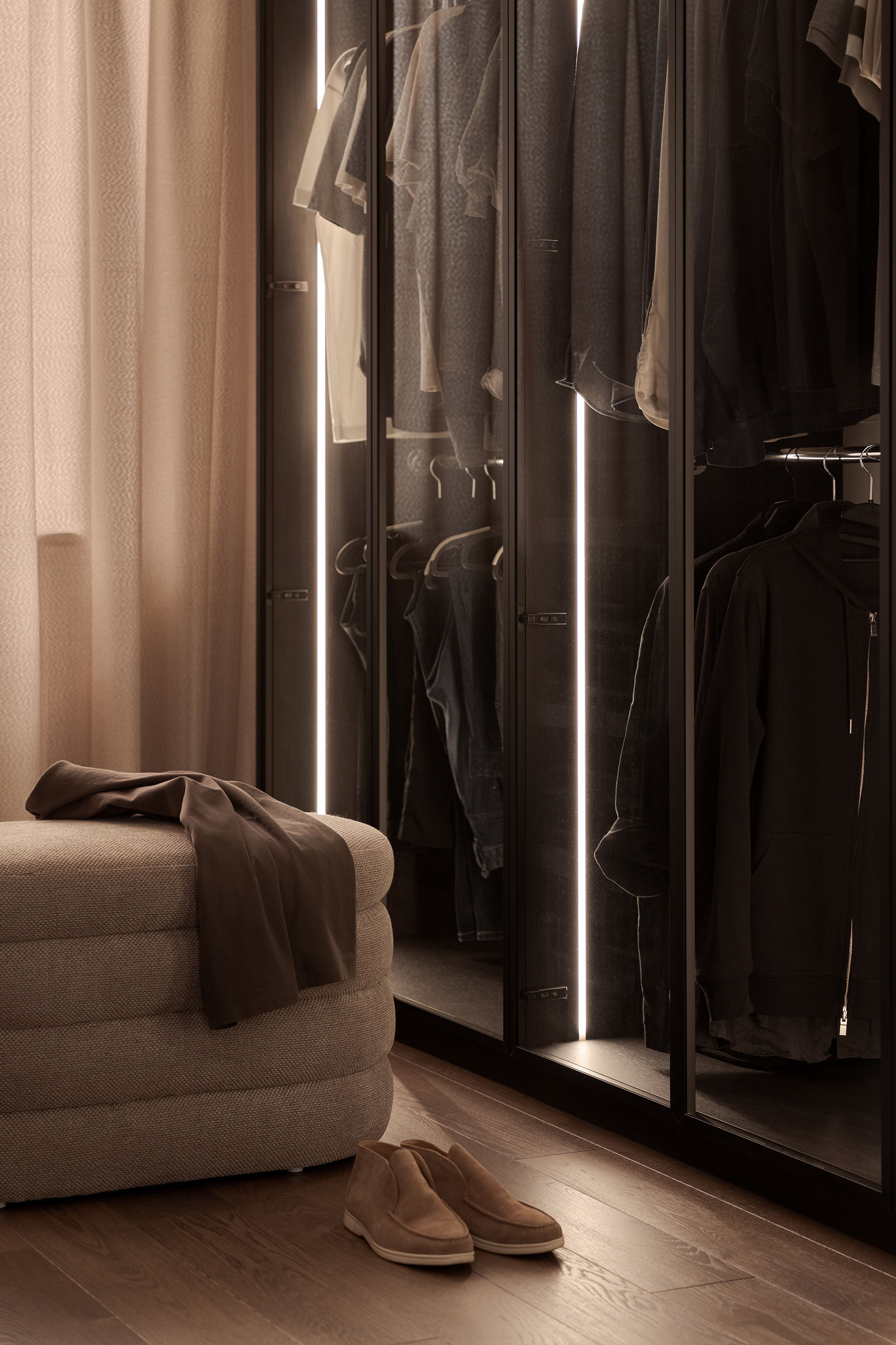Prawdziwym zaskoczeniem tej realizacji okazała się jednak garderoba. Zaprojektowana na wzór butiku, szybko stała się ulubionym miejscem właściciela, oferując liczne, inteligentnie ukryte schowki.