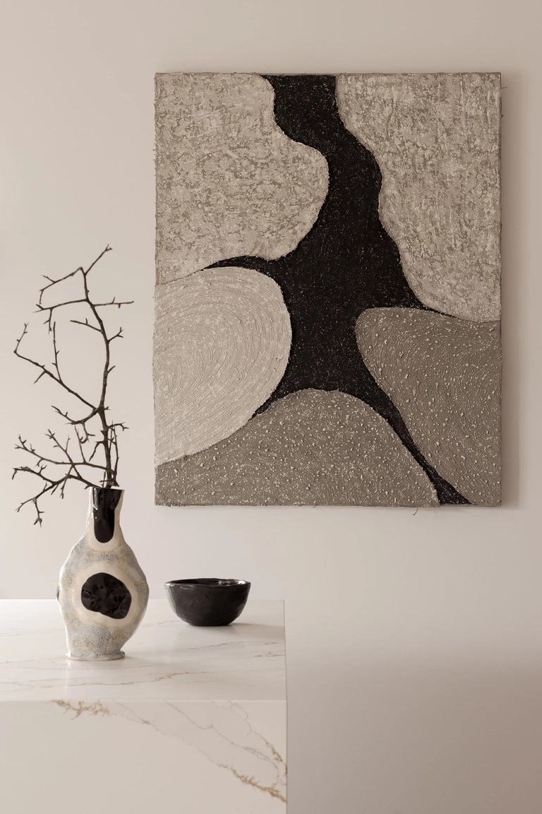 Projektantka wprowadziła do wnętrza rytm, wykorzystując lamele Mardom oraz ciemno wybarwioną deskę podłogową marki Mad Podłogi. Te pionowe i poziome podziały nadają całości architektonicznej dyscypliny, którą zmiękczają organiczne tekstury obrazów Magdaleny Głodek. To właśnie jej malarstwo stało się jedną z głównych inspiracji dla całej aranżacji, wprowadzając do strefy dziennej potrzebną głębię i artystyczny pierwiastek.