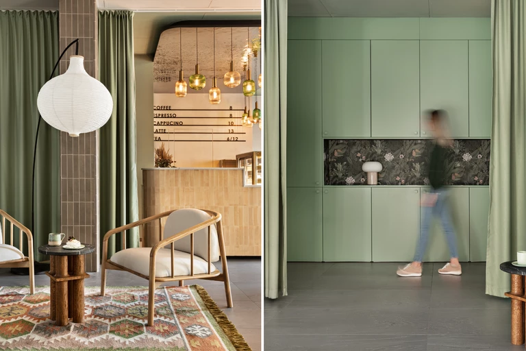 Przewodnim motywem kolorystycznym jest szałwiowa zieleń – pokryła część sufitu i ścian, zielone są również zabudowa meblowa oraz zasłony, które pozwalają podzielić otwartą salę kawiarni na mniejsze strefy. Tkaniny to również świetny patent na poprawienie akustyki wnętrza oraz przysłonięcie baru podczas koncertów.