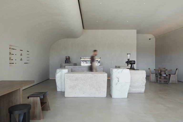Kawiarnia została zaprojektowana przez firmę VSHD. Główną inspiracją architektów były  piękne niedoskonałości występujące w naturze. Prosty w formie, bogaty w fakturę i materiały projekt kawiarni ukazuje piękno, które można odnaleźć w lokalnym krajobrazie. Zdecydowano się na wykorzystanie stonowanego tynku i kremowych odcieni nawiązujących do naturalnych elementów, takich jak piasek, muszle, kamień i drewno.