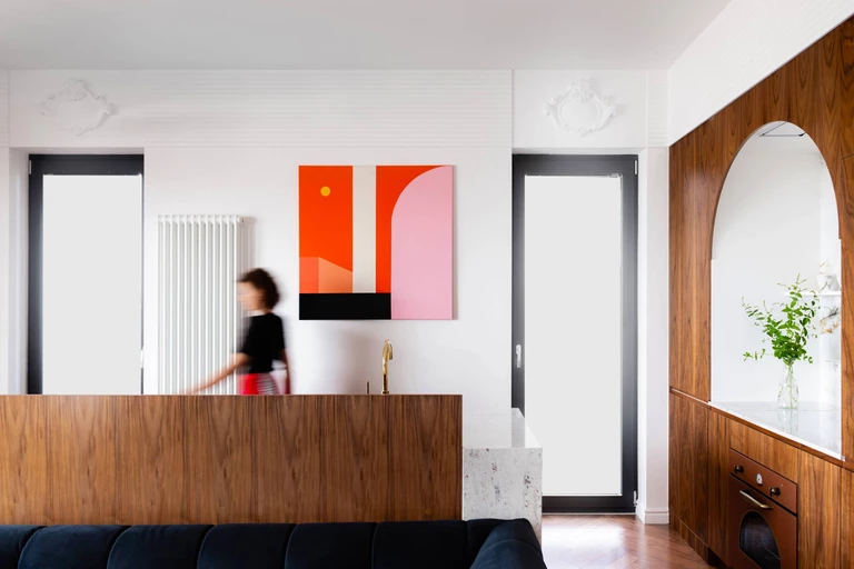 Architekci połączyli w tym wnętrzu elementy klasyczne, takie jak rozety i panele na ścianach, złote dodatki oraz drewniane meble z minimalistycznymi zabudowami oraz współczesną sztuką i wzornictwem.