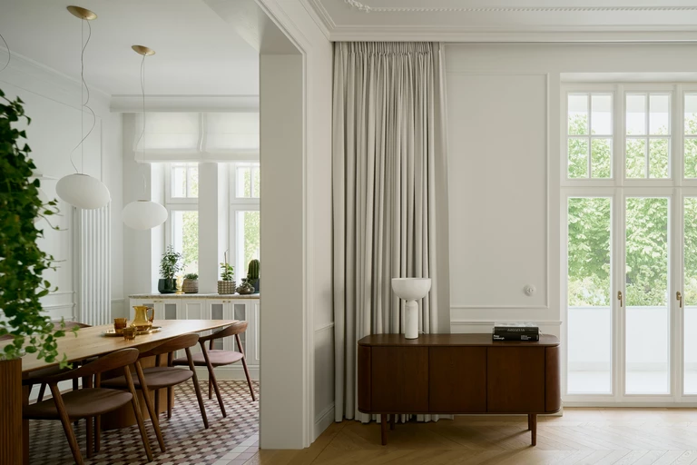 Właścicielom mieszkania zależało na tym, by ukryć wszystkie prywatne przedmioty, dlatego powstało wiele zaprojektowanych na wymiar przez Amelię i Filipa Symonowiczów mebli. Podobają się im też czyste, białe przestrzenie, sztukaterie i minimalizm utrzymany w stylu charakterystycznym dla kamienic. Niestety większość oryginalnych detali była w złym stanie lub nie zachowała się. Udało się uratować jedynie piec kaflowy, który odnowiono, odtworzono też dawną stolarkę okienną.