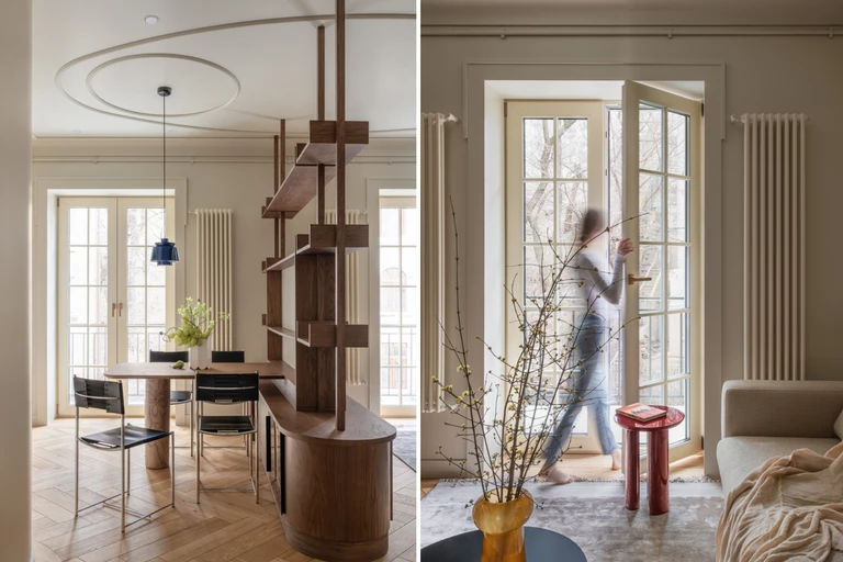Jednym z głównych założeń projektowych było zapewnienie harmonijnego połączenia wnętrza z architekturą budynku. Nastia Mirzoyan wprowadziła więc detale nawiązujące do estetyki epoki, w której wzniesiono budynek. Odnajdziemy tu parkiet układany w jodełkę XXL, oryginalne, eliptyczne sztukaterie sufitowe, grzejniki żeberkowe czy okna ze szprosami i miedzianymi okuciami.