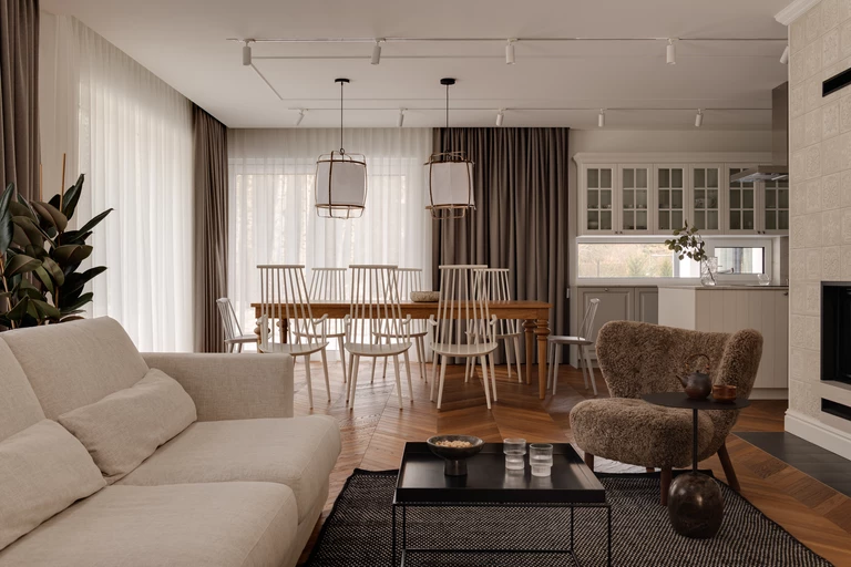 W centralnym punkcie części jadalnianej znalazł się dębowy stół polskiej marki Miloni. Przestrzeń doświetlono wykonanymi z naturalnych materiałów lampami Ay illuminate, inspirowanymi naturą. Przestrzeń jadalni i kuchni dodatkowo zaakcentowano obniżeniem sufitu, w który wpuszczono oświetlenie techniczne.