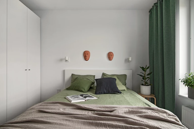 Mieszkanie zaprojektowane zostało dla grafika, któremu zależało na przestronnym, funkcjonalnym, jasnym miejscu do życia. Głównym wyzwaniem w procesie projektowania stało się więc stworzenie minimalistycznego wnętrza na bazie bieli, drewna i odcieni zieleni. Ważnym elementem procesu było też umożliwienie bezinwazyjnej zmiany dodatków w każdym momencie.