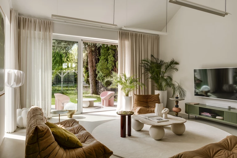 Poza meblami znanych międzynarodowych marek, takich jak Meridiani, &Tradition czy Gubi, we wnętrzu są meble i dodatki od polskich projektantów. Znajdziemy tu lampy marki Lexavala projektu Jakuba Szkaradka czy stół i krzesła od firmy The Good Living.
