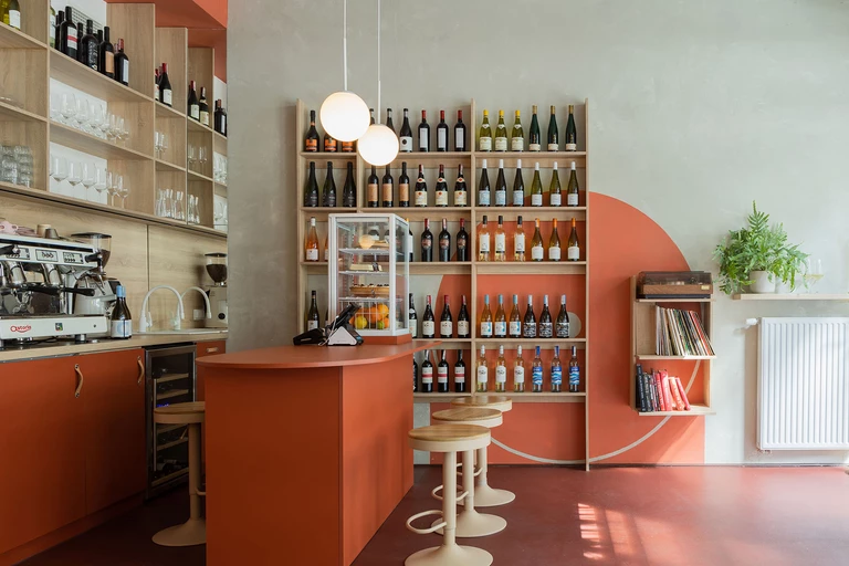 Układ tego 64-metrowego lokalu o podłużnym kształcie pozwolił na wyznaczenie dwóch stref o nieco odmiennym charakterze. Pierwsza strefa wraz z barem ma bardziej otwarty i społeczny charakter, wita gości siedziskami o zróżnicowanej formie: wygodnych puf, rozłożystych foteli czy taboretów. Najważniejszym elementem tej przestrzeni jest zaokrąglona, ceglasta lada barowa, która zaprasza klientów, by przysiedli na kieliszek wina i pogaduchy z właścicielami.
