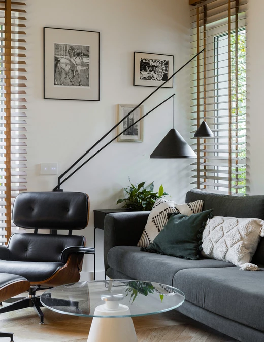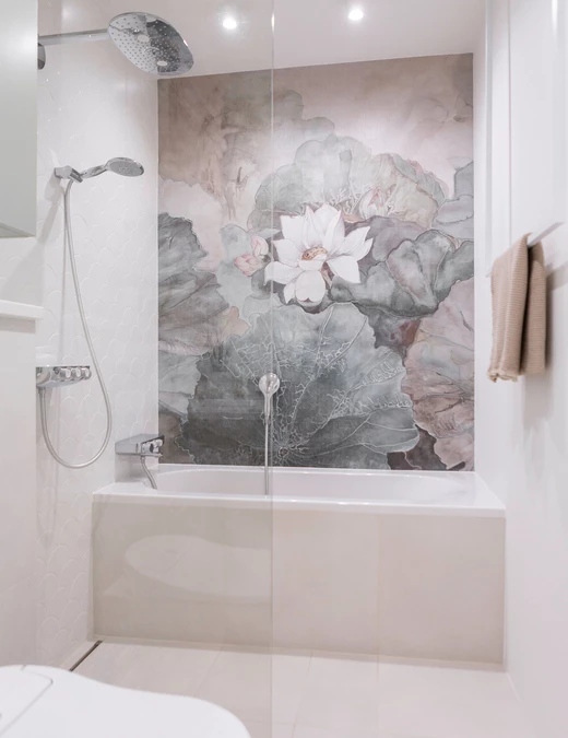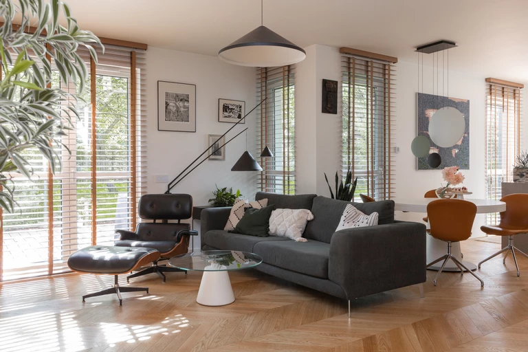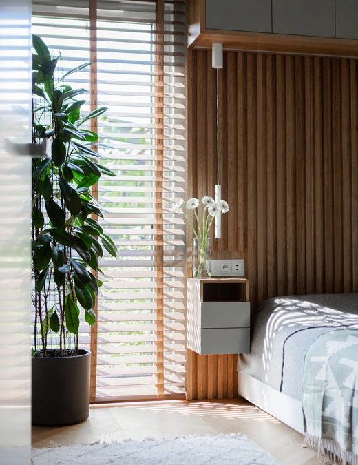 Mieszkanie miało być przede wszystkim jasne, funkcjonalne, oddające charakter inwestora. Wskutek tego połączona została męska elegancja z kwiecistymi, lekkimi akcentami. Całość podkręcają nowoczesne, ciekawe rozwiązania: tapeta w łazience czy ukryte drzwi do pomieszczeń. Szklane blaty kuchenne odbiją światło wpadające do mieszkania, a drewniane żaluzje przepuszczają promienie słońca, zapewniając lokatorom intymność.