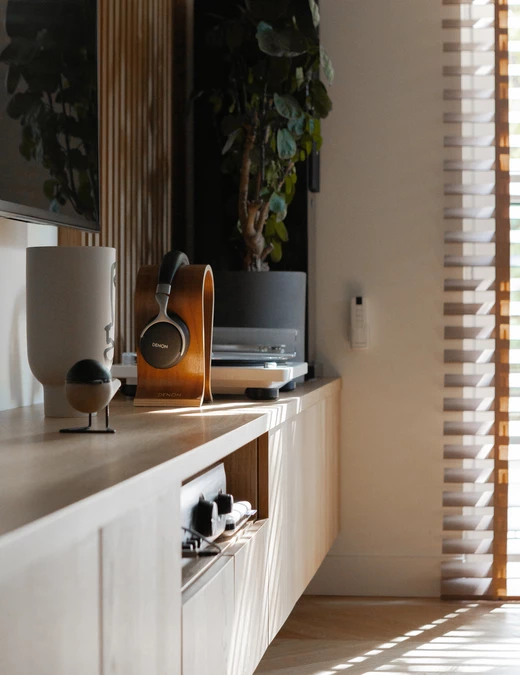 Jasna dębowa podłoga, dekoracyjne drewniane lamele oraz bogata roślinność ocieplają wnętrze i doskonale komponują się z tak ważną dla inwestora sztuką. Obraz wiszący w części jadalnianej, czarno-białe grafiki w salonie czy ceramiczny wazon ze zdobieniem w kształcie twarzy nadają wnętrzu indywidualnego charakteru.