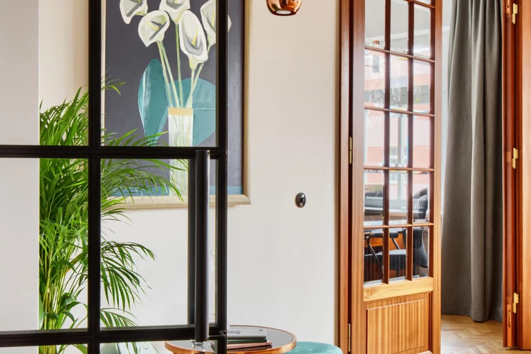 Pokój spotkań funkcjonuje tu jak domowy salon, pozwalając zarówno na mniej formalną rozmowę przy kawie jak i na spotkanie biznesowe w większym gronie. Naturalny Dąb sąsiaduje tu z czernią stali, oryginalnymi drzwiami z epoki, czy zielenią roślinności.