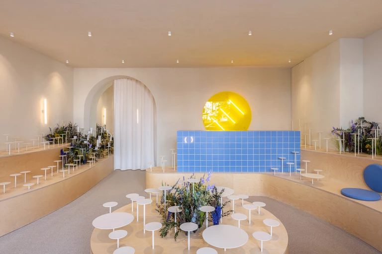 Astry umieszczono w otworach drewnianej zabudowy w głównym pomieszczeniu kliniki. Towarzyszą im przypominające te kwiaty, drewniane stojaki, na których można wyeksponować sprzedawane na miejscu kosmetyki. Co ciekawe, wszystkie te elementy można zdemontować, uzyskując pustą trybunę. Zabieg ten umożliwia szybkie przearanżowanie przestrzeni celem prezentacji produktów czy organizacji innych wydarzeń.
