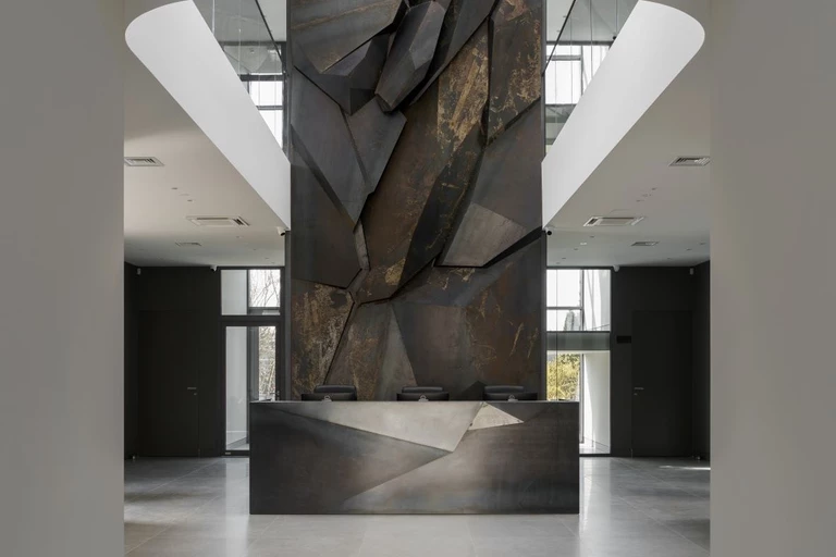 Wszystkie wymienione tu wątki splatają się w zjawiskowej, wysokiej na trzy kondygnacje ścianie za ladą recepcyjną. Powstała tu spektakularna forma rzeźbiarska, przypominająca wnętrze wulkanu, w której znakomity artysta Tomasz Górnicki zinterpretował formy znalezione w skalistym krajobrazie. Pełną dynamizmu tektonikę brył za dnia podkreślają promienie słoneczne wpadające przez świetlik dachowy, po zmroku z kolei – światło sączące się ze szczelin kompozycji. Częścią założenia stał się także sam kontuar, co dodatkowo podkreśla monumentalny charakter tej realizacji.