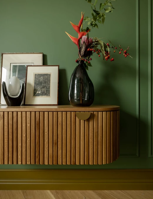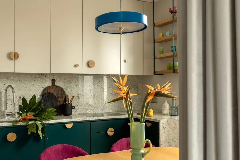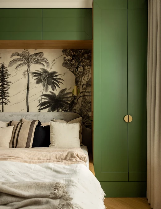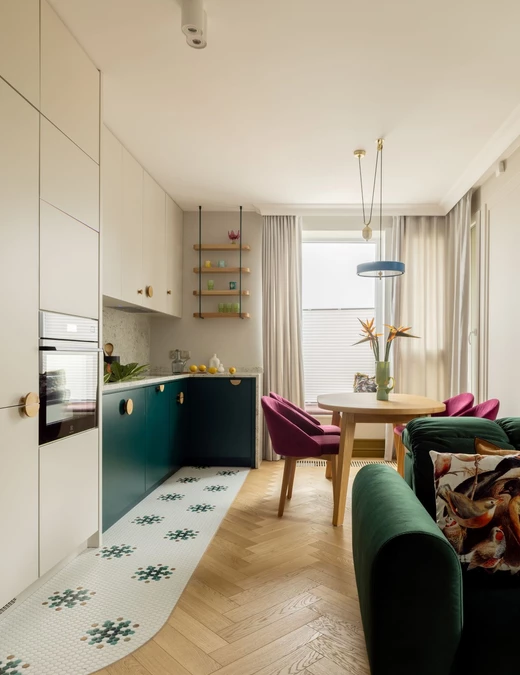 – Projektując zawsze staramy się przemycić do wnętrza elementy, które będą go odróżniać od innych realizacji – wyjaśnia Magda. – Staramy się nie stosować rozwiązań, które są kalką pomysłów podpatrzonych na Instagramie czy Pintereście. To, co niewątpliwie je wyróżnia, to kolorystyka, a raczej dość odważne zestawienia pozornie niepasujących do siebie tonacji. Przewodzi zieleń – miks ciepłych i zimnych tonów. W salonie centralne miejsce zajmuje rozłożysta sofa w szmaragdowym odcieniu – pięknie łączy się z frontami szafek w otwartym aneksie kuchennym. Dolny rząd w odcieniu butelkowej zieleni ładnie komponuje się z górnym w tonacji kremowego beżu.