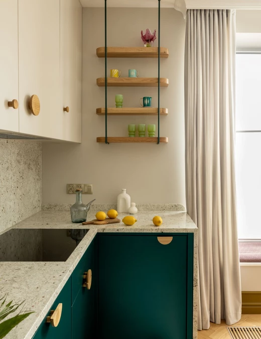 Właściciele lubią porządek, tym bardziej, że kuchnia płynnie przechodzi w salon, dlatego w jednej z szaf zaprojektowano specjalną platformę na teleskopowych prowadnicach. Ciekawym pomysłem jest też lekka półeczka na ścianie – również specjalnie zaprojektowana do tego mieszkania. Inwestorzy chcieli mieć miejsce na wyeksponowanie kolekcji szkła i ćmielowskiej porcelany.