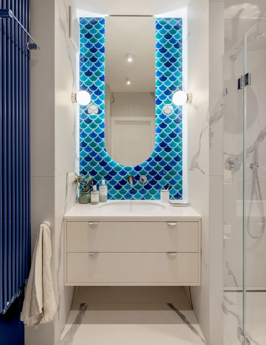 Rzecz, która łączy kuchnię z salonem będąc piękną dekoracją obu pomieszczeń, to mozaika – a raczej chodnik z misternie ułożonych kosteczek. Z heksagonalnych kafelków w wersji mini ułożono kompozycje jak z dziecięcego kalejdoskopu. Mozaika ładnie koresponduje z dębową jodełką w salonie i turkusową ścianą „telewizyjną”. Chłodny błękit i ciepła zieleń, która przy zachodzącym słońcu mieni się jak szlachetne złoto, podbijają się wzajemnie, dając bardzo ciekawy efekt.