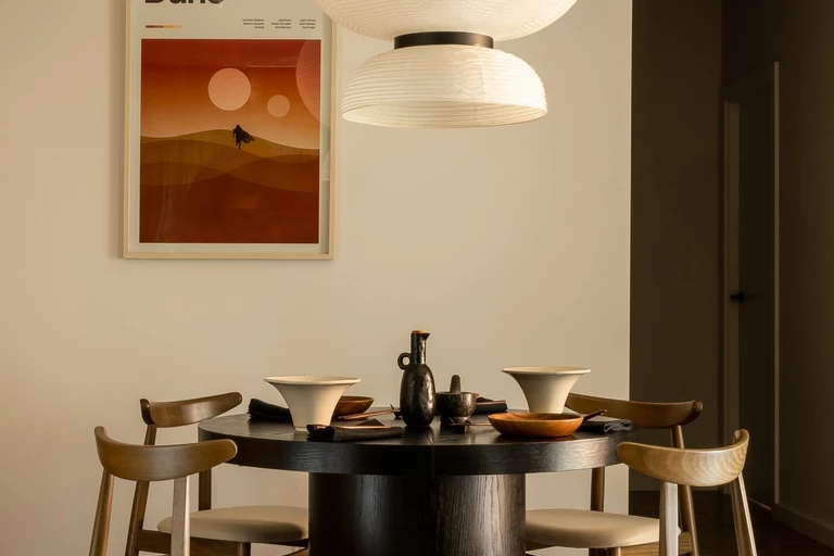 W jadalni centralnym punktem jest masywny, czarny stół, wokół którego rozstawiono klasyczne krzesła Fameg. Charakter przestrzeni buduje także oświetlenie – lampa Formakami projektu Jaime Hayona dla &Tradition emituje miękkie, rozproszone światło, podkreślając przytulność wnętrza. Całość dopełniają starannie dobrane detale, takie jak japońskie naczynia – w tym talerze do ramenu z kolekcji ATO Ceramika dla Ramen People, zdobione motywem ryb koi.
