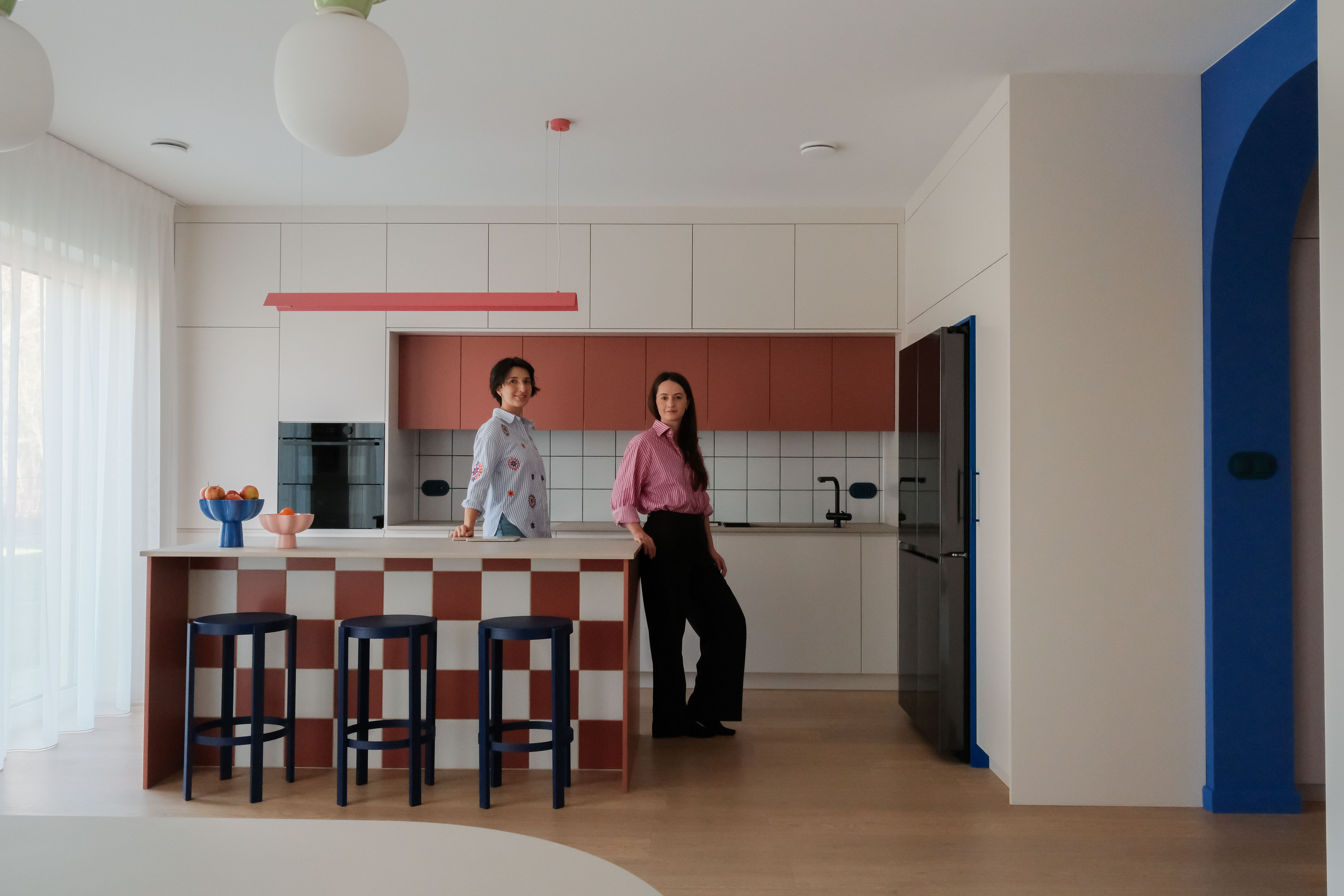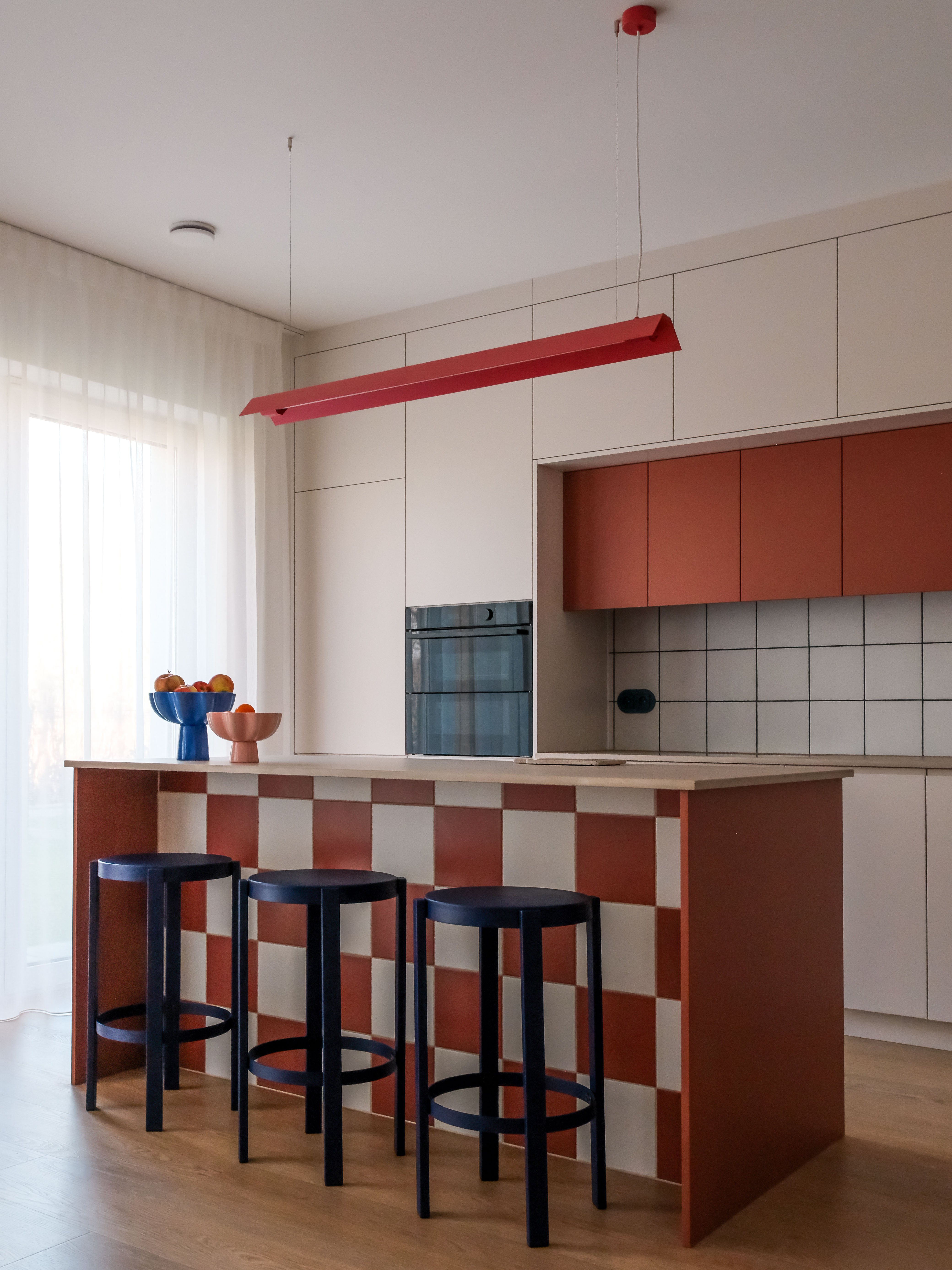 Po drugiej stronie jadalni projektantki umieściły kuchnię, w której panują mocne akcenty kolorystyczne. Pojawia się bordo i czerwień, zestawione z kremowymi frontami oraz detalami w odcieniu indygo. Projektantki utrzymały zabudowę w minimalistycznej formie, żeby kolor mógł wybrzmieć bez konkurencji ze strony nadmiaru ozdobników.