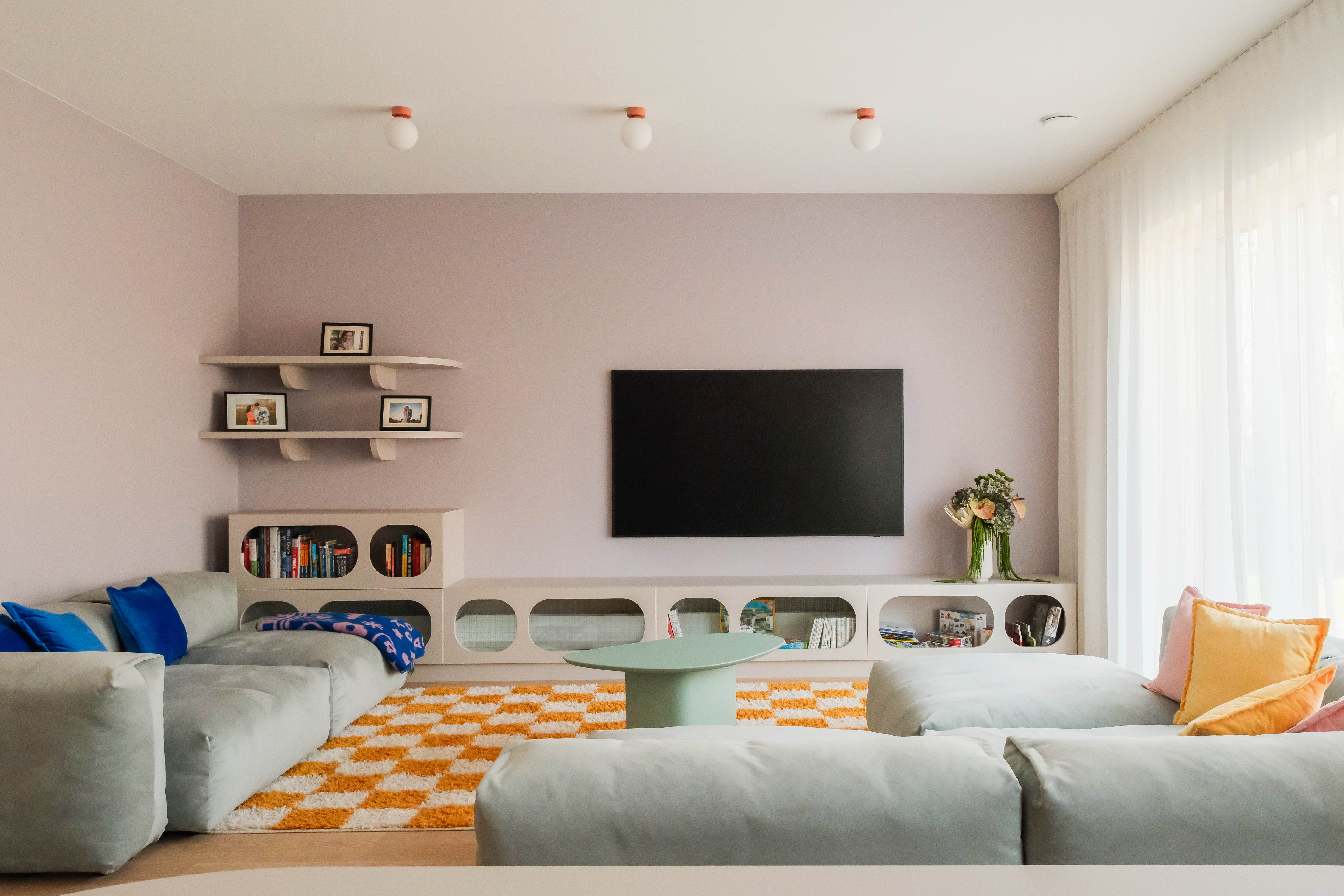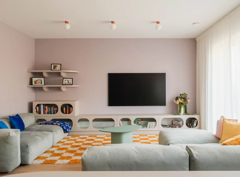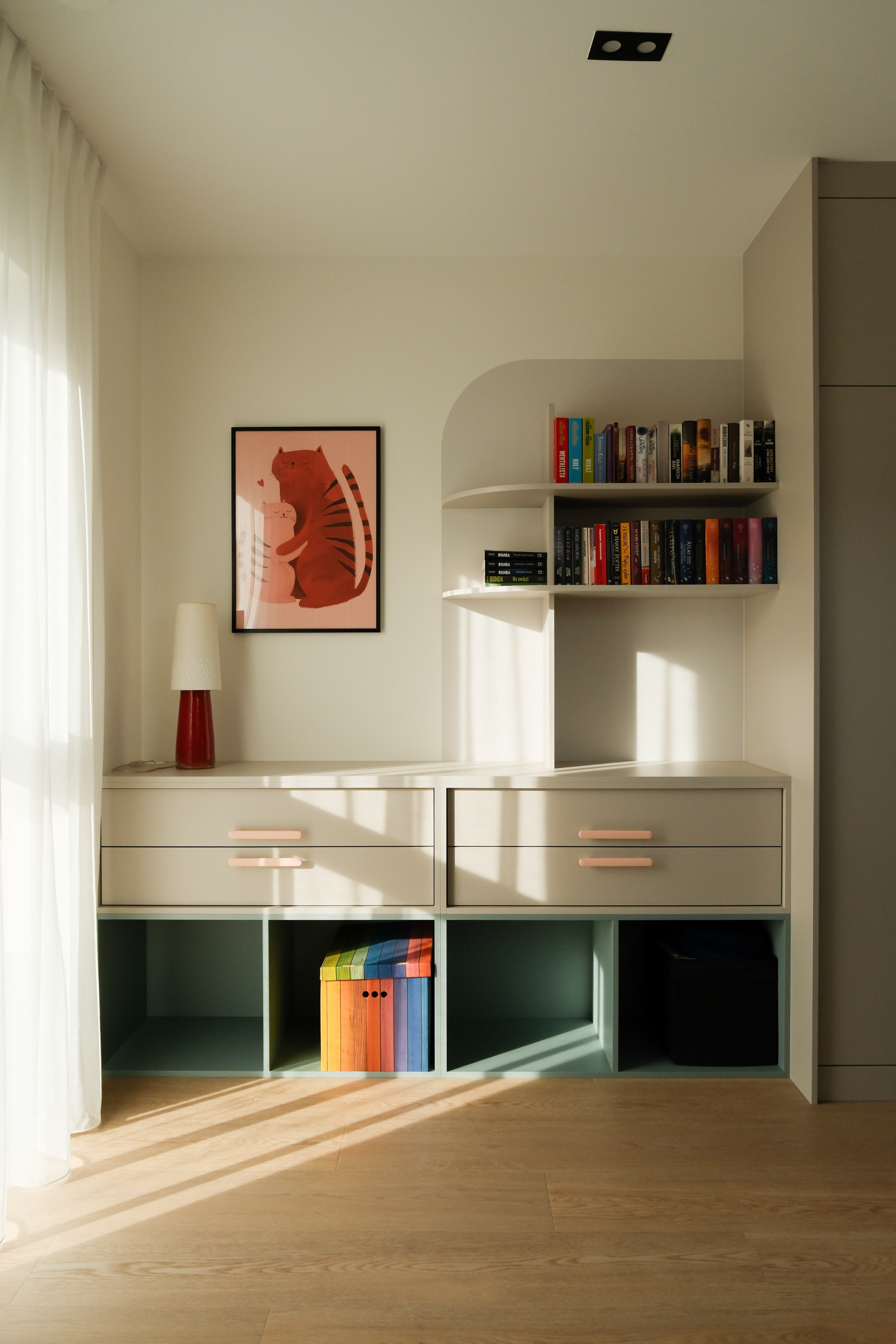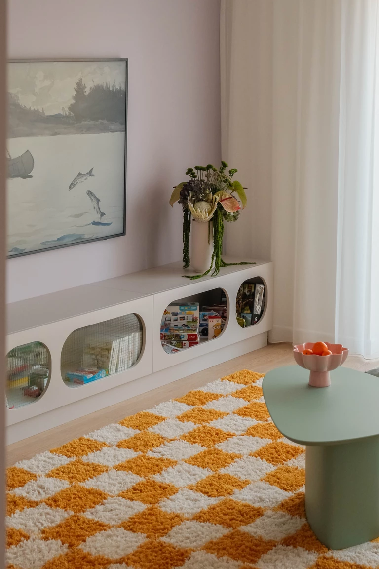 Salon zaprojektowały jako miejsce wielu codziennych scenariuszy. Do zabawy z synkiem, odpoczynku wieczorem, czy też przyjmowania gości. Ważną rolę odgrywa nietypowa zabudowa pod telewizorem – mieści jednocześnie sprzęt RTV, książeczki dziecięce i zabawki oraz niewielką biblioteczkę właścicieli. Dzięki temu jeden mebel przejął kilka funkcji i ograniczył potrzebę dodatkowych elementów wyposażenia.