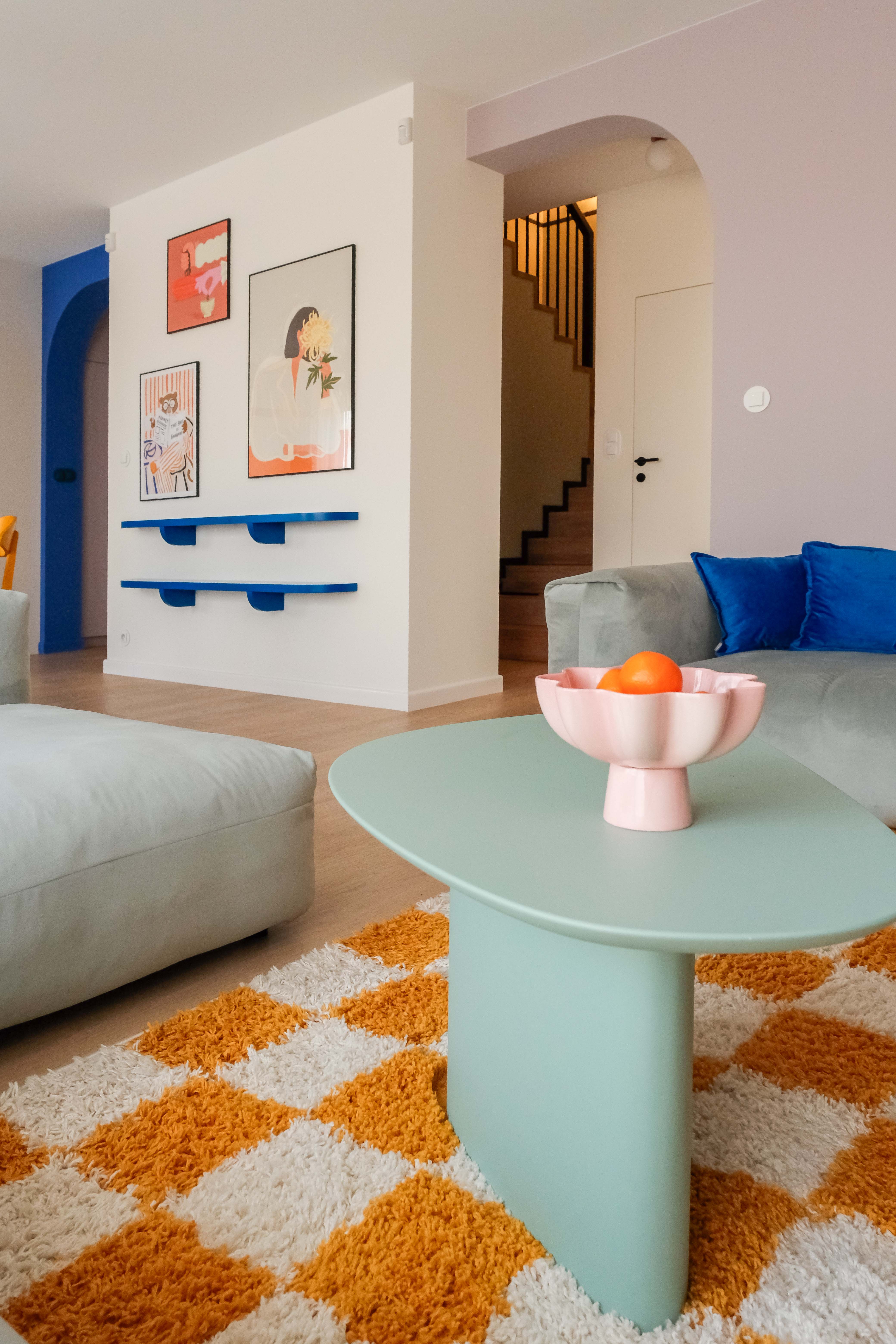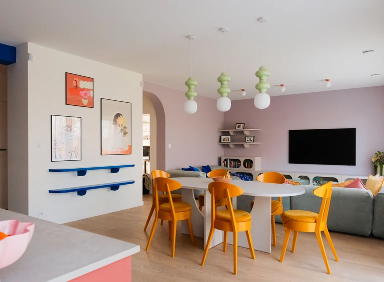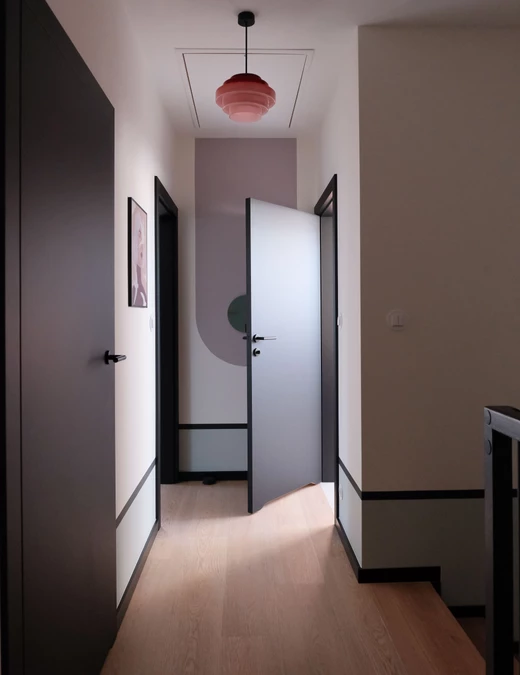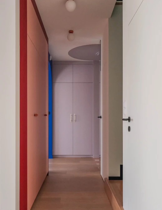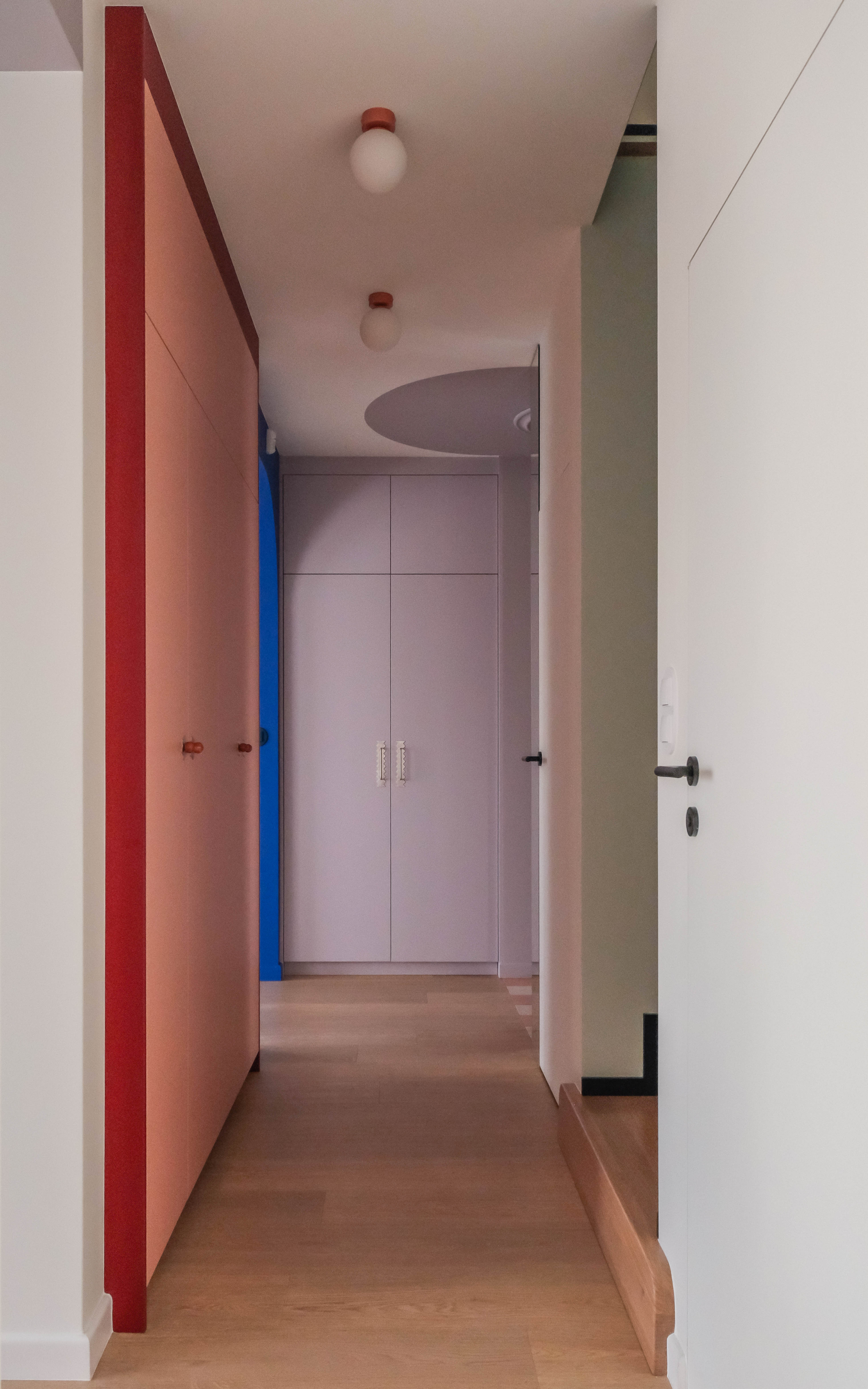Projektantki postawiły w tej realizacji na energiczną pastelową paletę barw. Chciały, żeby ociepliła domownikom codzienność. Ta decyzja projektowa rzuca się w oczy już od progu. Strefę wejściową i korytarz poprowadziły odważnymi barwami zabudów, które prowadzą w głąb domu i dyskretnie maskują pomieszczenia pomocnicze.