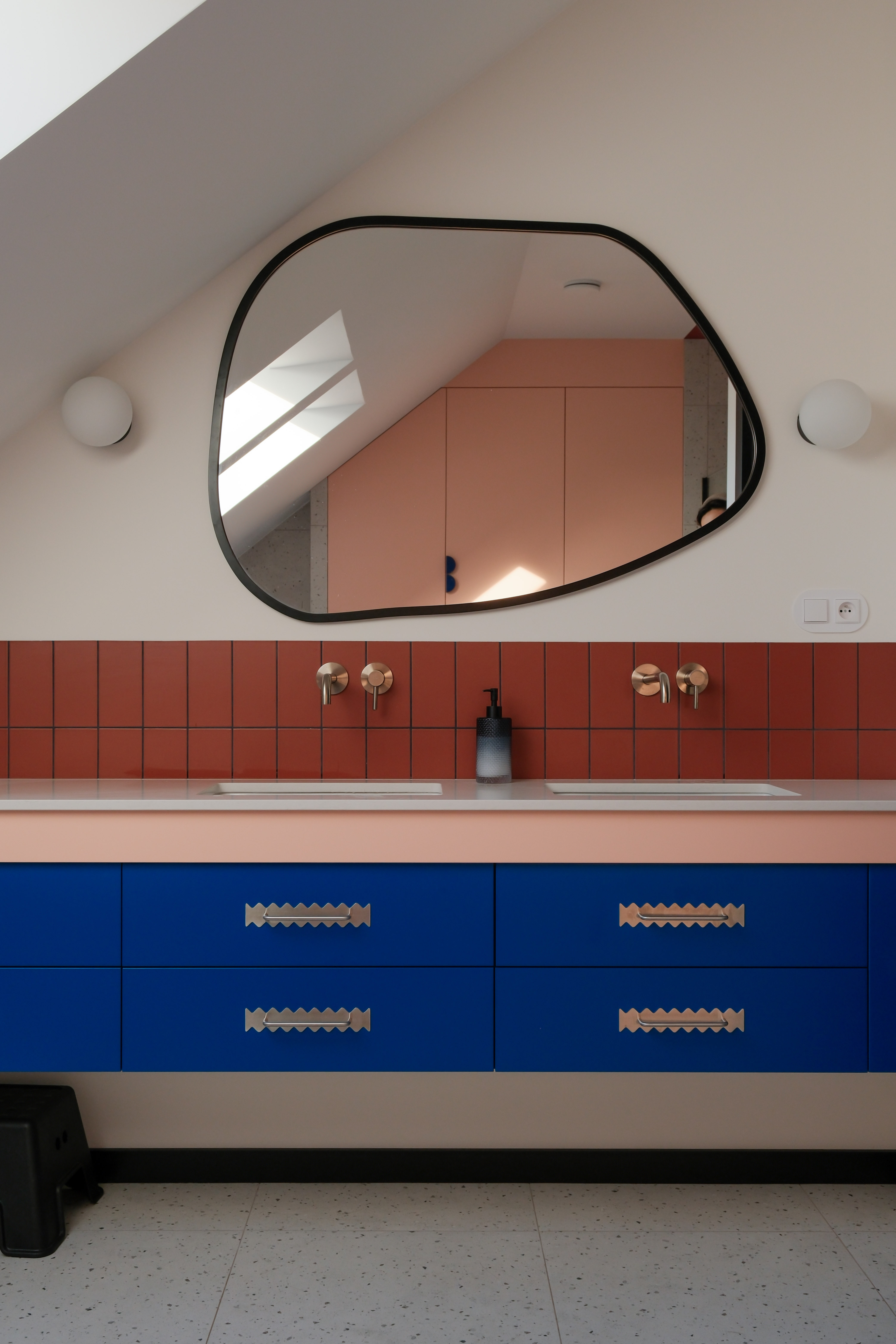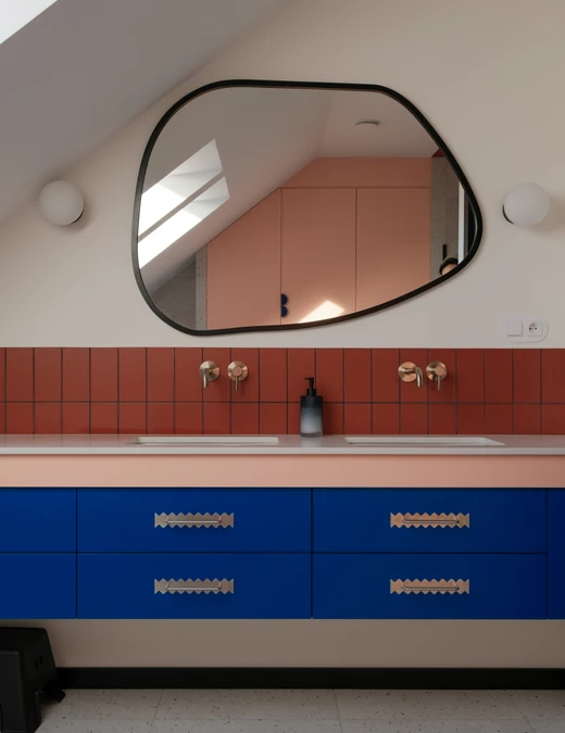W łazience rodziców projektantki postawiły na światło i subtelne nawiązania do palety barw z parteru. Delikatne róże i bordo połączyły z głębokim odcieniem niebieskiego obecnym w zabudowie umywalkowej oraz w detalach strefy WC.