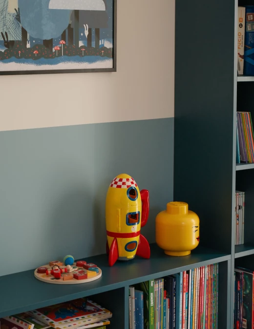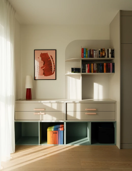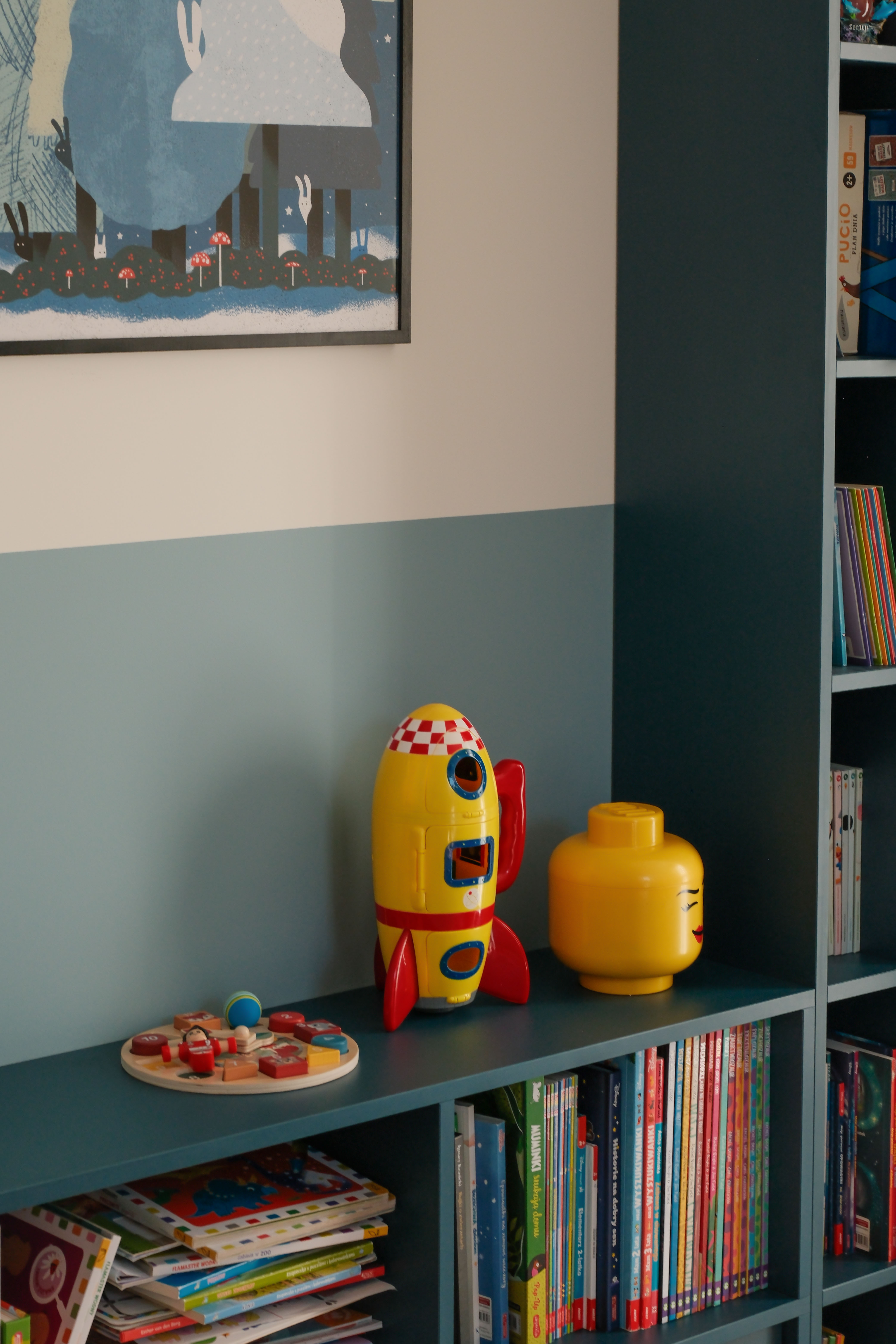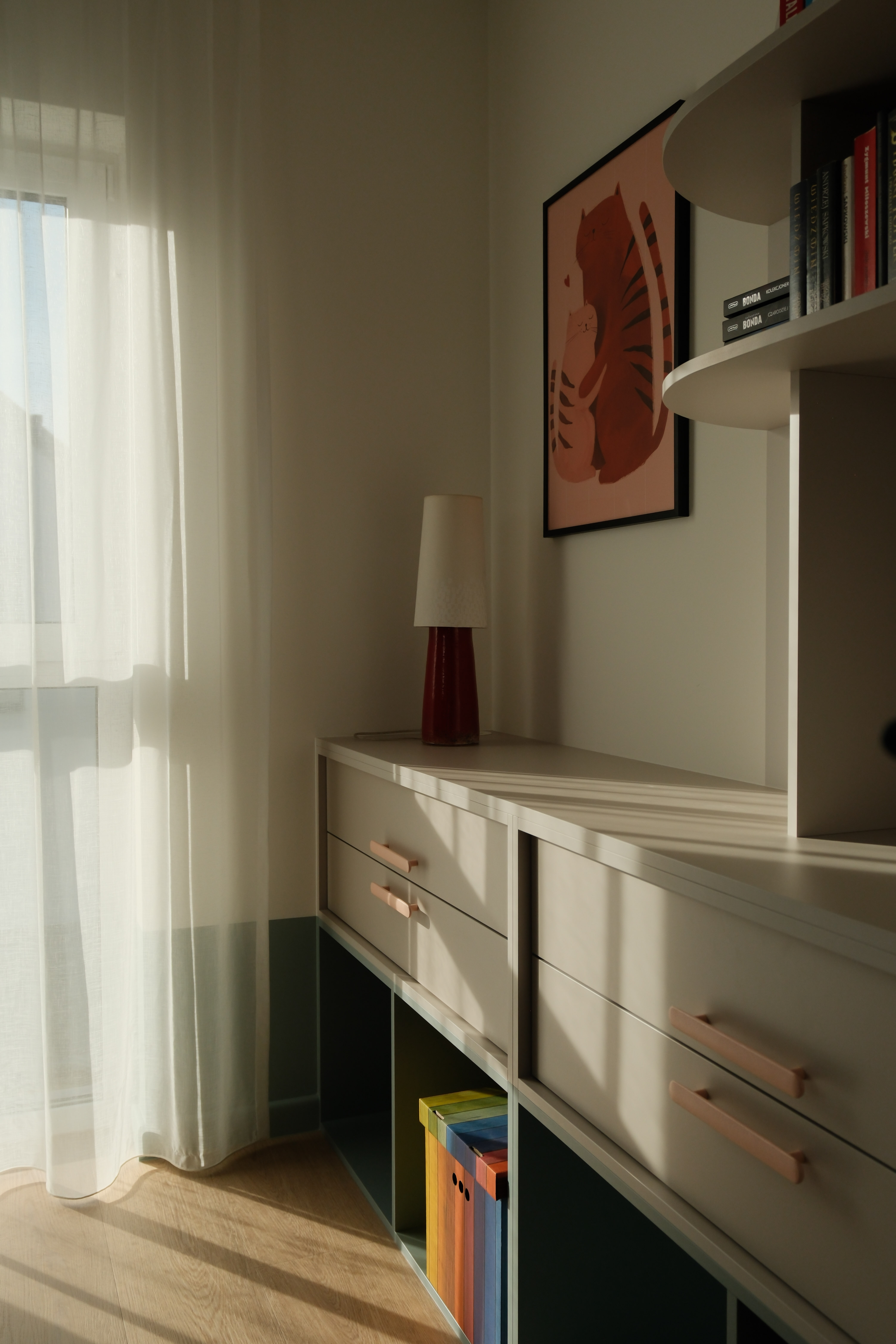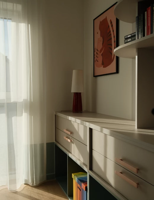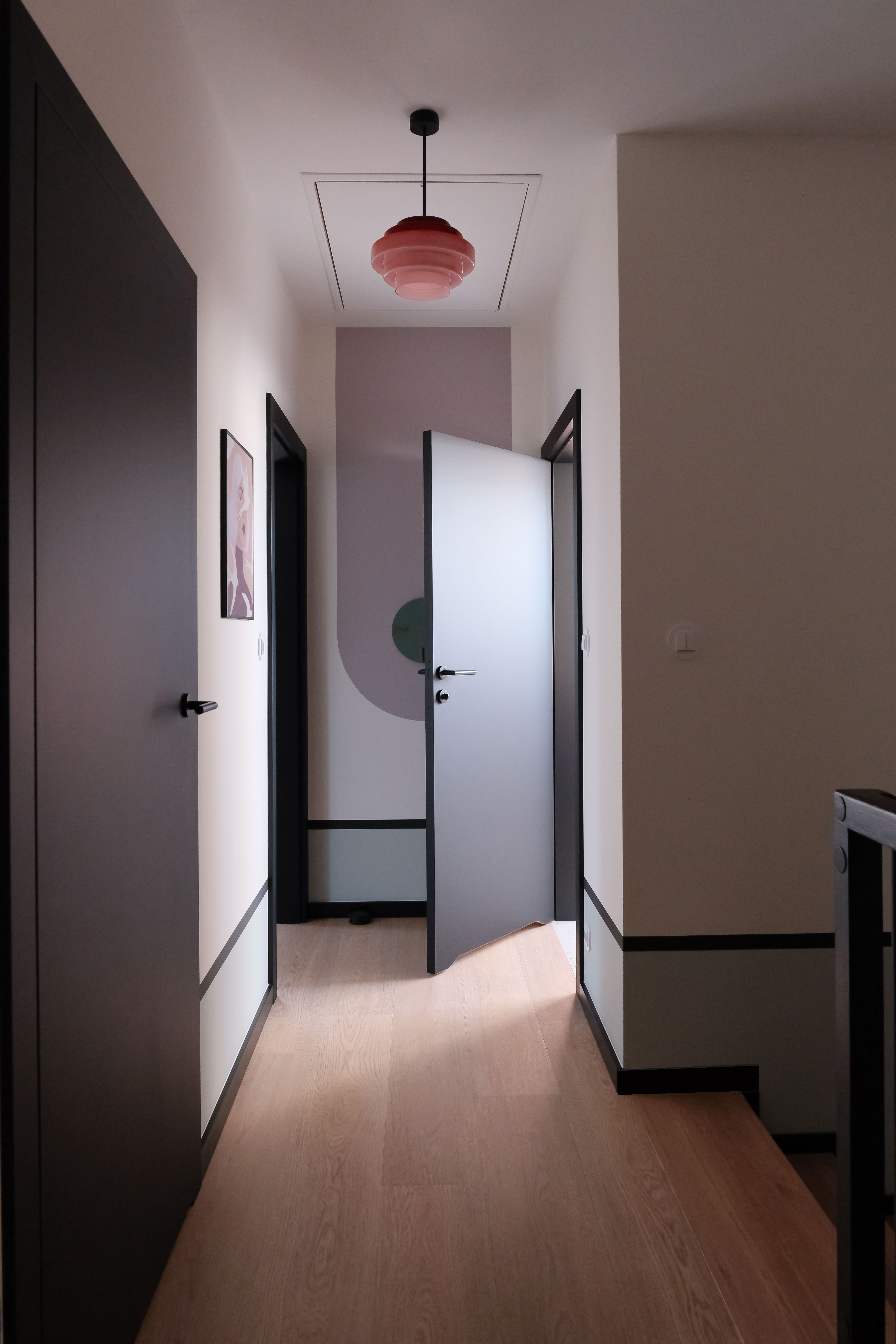Na piętrze panuje wyciszenie. Barwy z parteru stają się łagodniejsze, a drzwi do sypialni nie dominują długiego korytarza, tylko pracują jako element całości. Pokój chłopca projektantki opracowały z kolei pod kątem aktywności i rozwoju. Zabudowy ułatwiają odkładanie rzeczy na miejsce i dają elastyczną bazę do codziennych zabaw.